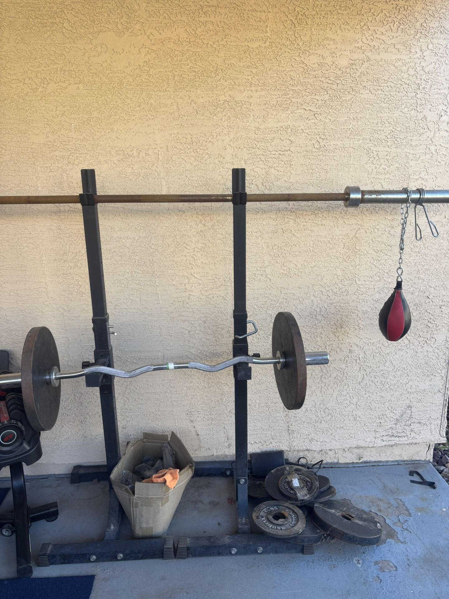 Comes with 7’3” olympic (45lbs) press bar with locks , 2(45lbs), 2(35lbs), 2(25lbs) 2(10lbs) , 4(5lbs), 2(2.5lbs) 1(curl bar), and bench press rack. Total of 225lbs weights asking $200 for all.