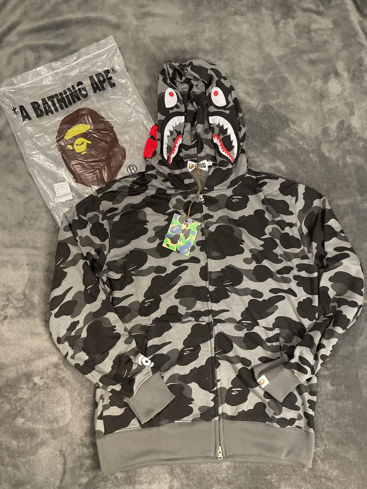 Says L but fits m Black and gray bape hoodie brand new with tags and bag