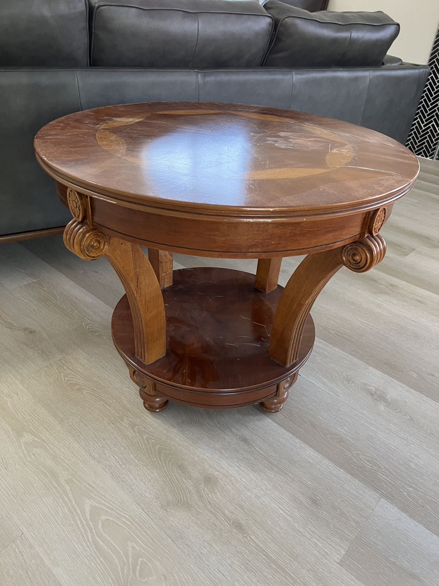 Wood end table. This is a used and loved table. Vintage wood pattern. Solid wood.