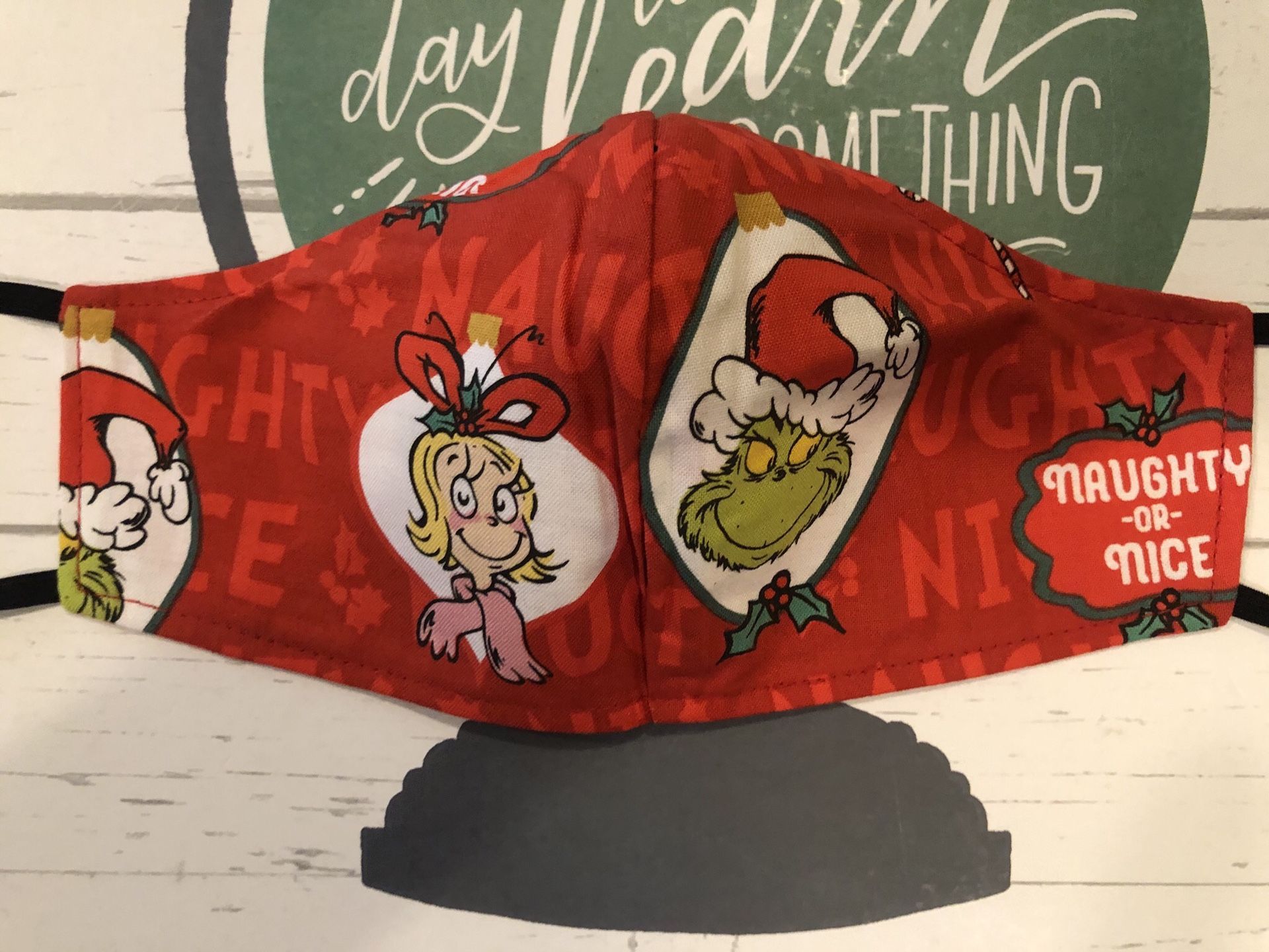 Handmade Grinch Face mask. Grinch stealing C-19 virus on solid red. Reverse side is Grinch fabric. All our masks are handmade and pattern may differ slightly than what is seen here. Bundle and save! ***on this fabric the placement of characters may vary and are not guaranteed**** $10 Pick Up price FIRM Also $10 + 2.95 via Zelle, Venmo or PayPal
