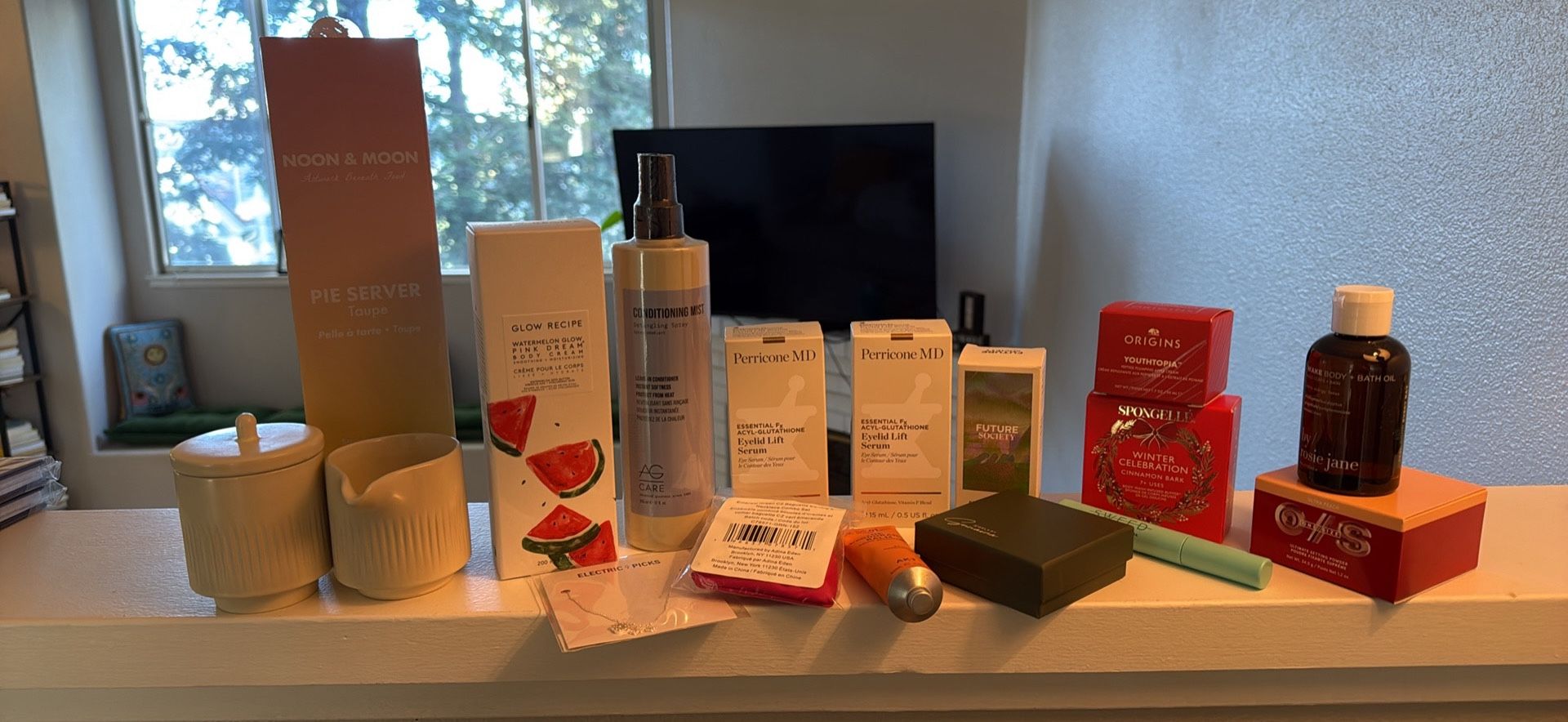 FAB FIT FUN subscription box items! completely unused. items are from 3 different fab fit fun boxes. ITEMS INCLUDED: -NOON & MOON PIE SERVER -CITRINE CREAM & SUGAR SET -GLOW RECIPE BODY CREAM -AG CARE CONDITIONING MIST -ELECTRIC PICKS NECKLACE -EMERALD GREEN EARRING & NECKLACE SET -2 PERRICONE MD EYELID LIFT SERUMS -AKT DEODORANT BALM -FUTURE SOCIETY FLOATING FOREST PERFUME -JEWELS BY SUNAINA EARRINGS -SWEED PRO LASH LIFT MASCARA -SPONGELLE BODY WASH INFUSED BUFFER -ORIGINS PEPTIDE PLUMPING CREAM -ROSIE JANE BATH OIL -ONE SIZE ULTIMATE SETTING POWDER $100 total OBO!