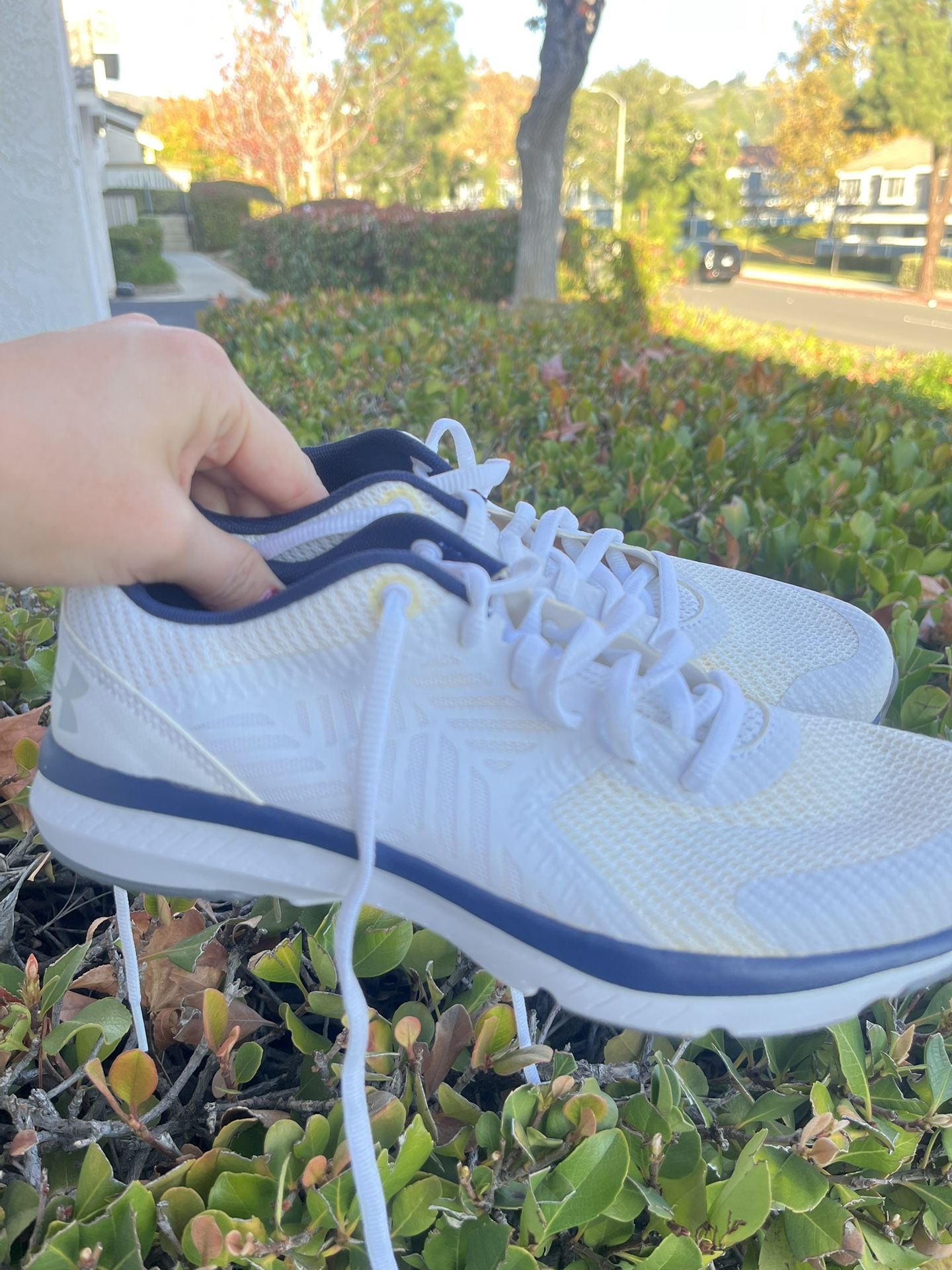 Under Armour Women’s Micro G Press White Running Shoes. Women’s Size 8. New. Only worn for about an hour inside. They were a Christmas gifts a few years ago, but unfortunately, they are too small for my feet.