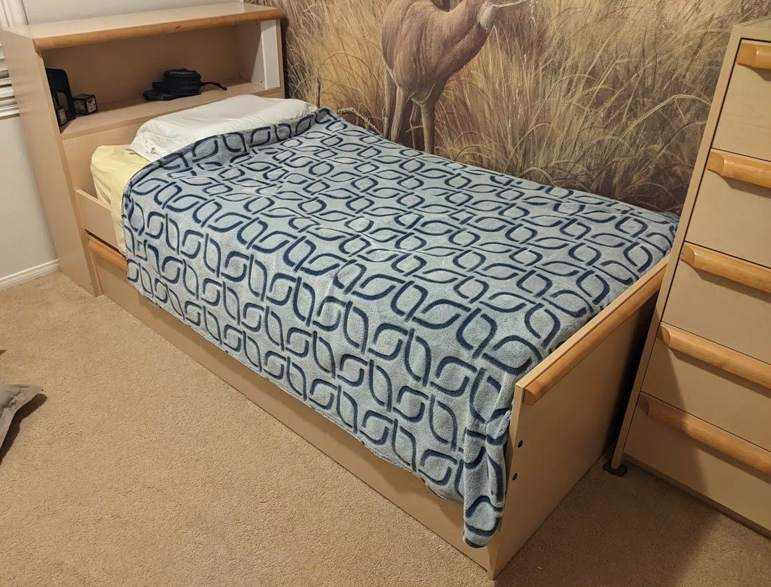 Selling this fantastic twin bed included with integrated drawers and a shelf for books or toys. it's part of a bedroom set that can also include a desk and dresser if desired, But each piece is available individually as well. Really high end furniture from Camelot that can withstand abuse and will last for generations.