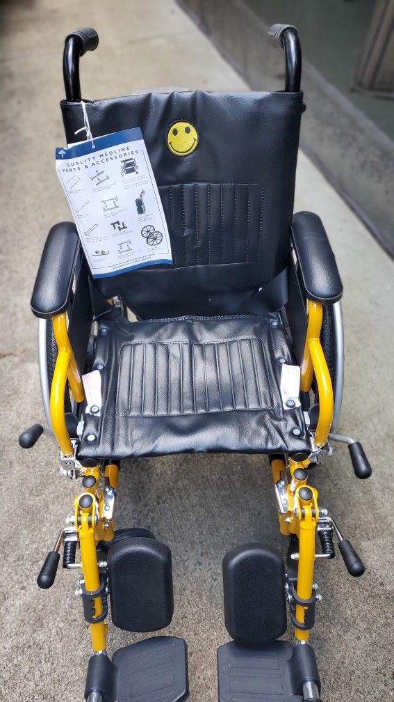 New for children 14w 12d seat DIMENSIONS: 30”L x 22.5”W x 36.5”H (assembled) and 30”L x 11”W x 36.5”H (folded); chair weighs 25 lbs., with a 250 lb. weight capacity ADDITIONAL FEATURES: The appealing design adds a touch of fun to your child’s mobility experience; telescoping handles allow for caregiver’s ease of use Yellow wheelchair with black seat and smiley face design.