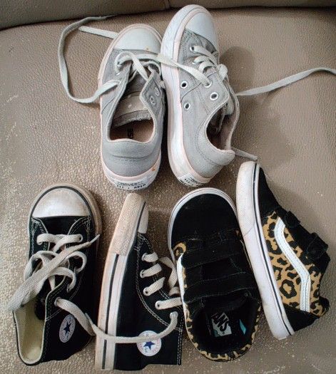 2 pairs of converse size 8 for black and 11 for grey and light pink. Vans are size 9. Picture shows they weren't even wore enough to ware out any of the branding on the sole. Been sitting a while just need a little cleaning. I can run through the wash before if you'd like. Make me an offer on individual or all 3 either way. In great condition. Pretty expensive shoes brand new in my opinion. Make your best offer! If the ads up I still have it!