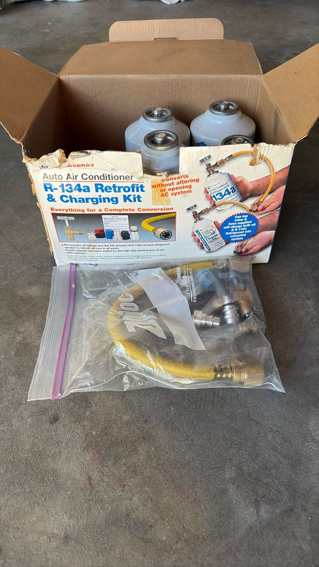 Hose, adapters, and (4) 12-ounce cans of 134a refrigerant