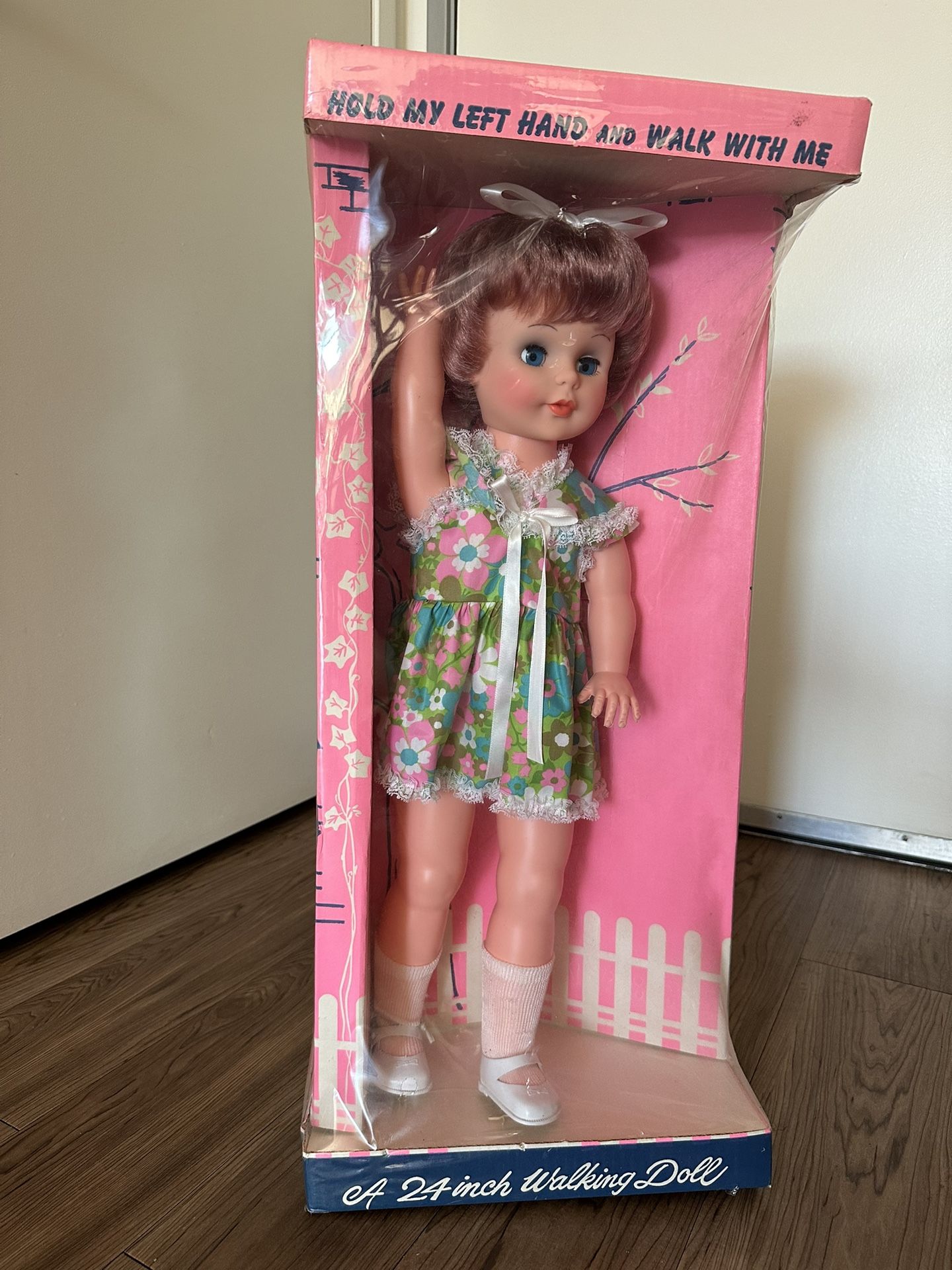 Vintage 24 inch Walking Doll in original packaging with the phrase “Hold My Left Hand and Walk With Me.” This classic mid-century walking doll appears mint and never removed from the box. The doll still has the factory plastic covering and original display insert. Features: • Approx. 24 inches tall • Classic walking doll mechanism (activated by holding the hand and walking with the doll) • Original floral dress with lace trim • White socks and Mary Jane shoes • Brown hair with ribbon bow • Bright blue sleep-style eyes • Original pink display box Condition: • Doll: Mint / never handled • Plastic still sealed around doll • No contact made with the doll • Box has one small indentation but overall displays very well • Great vintage display piece for collectors Perfect for: • Vintage doll collectors • Retro toy displays • Mid-century nursery decor • Gift for doll enthusiasts Sold as pictured.