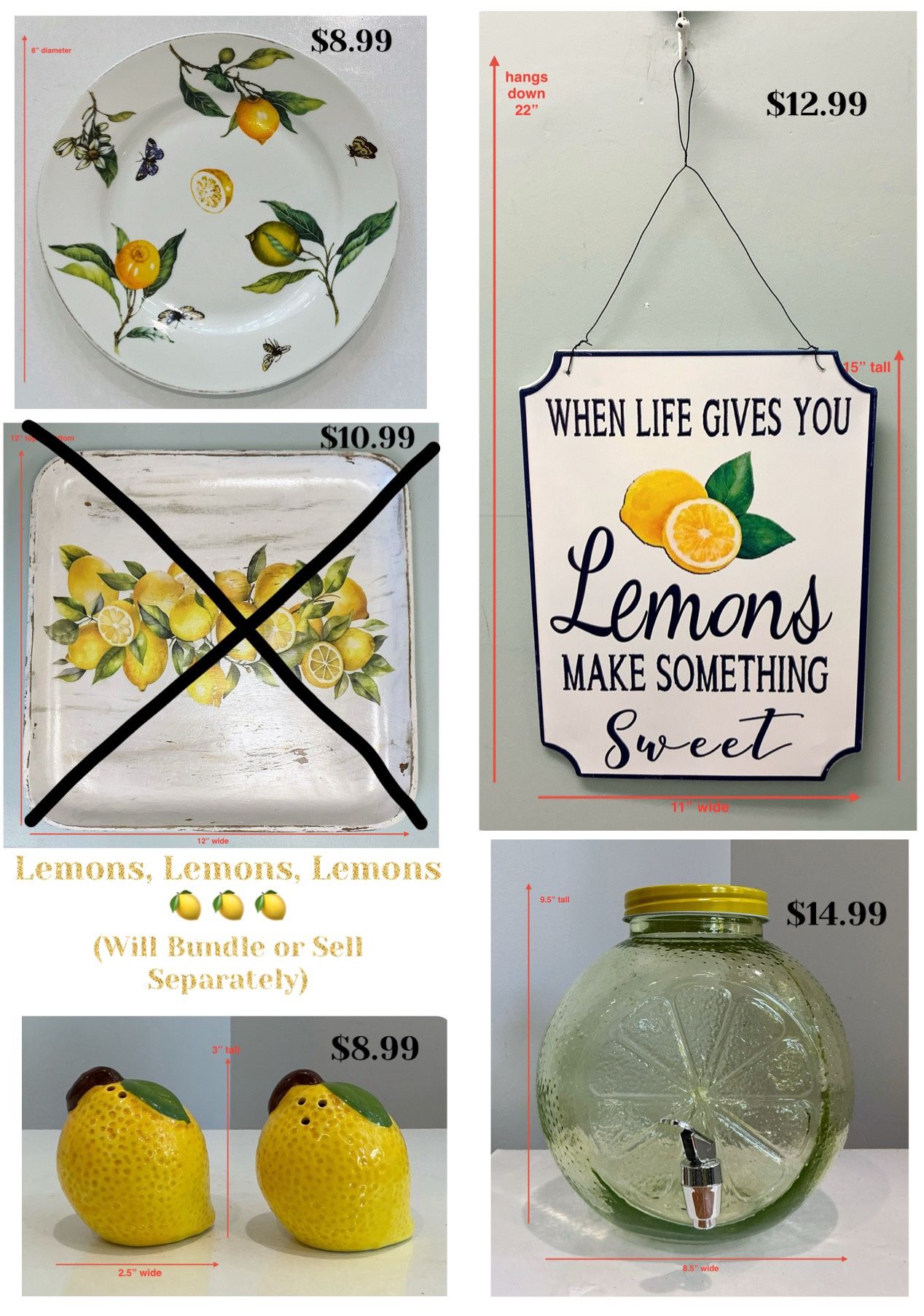 Who likes lemon decor??? These lovely lemon themed items can be bundled together, sold separately, or purchase whichever ones you want. The prices and measurements are posted on the first photo collage. Items marked with an “X” have sold. Photos from different angles for each item are also shown. FCFS/Cash only