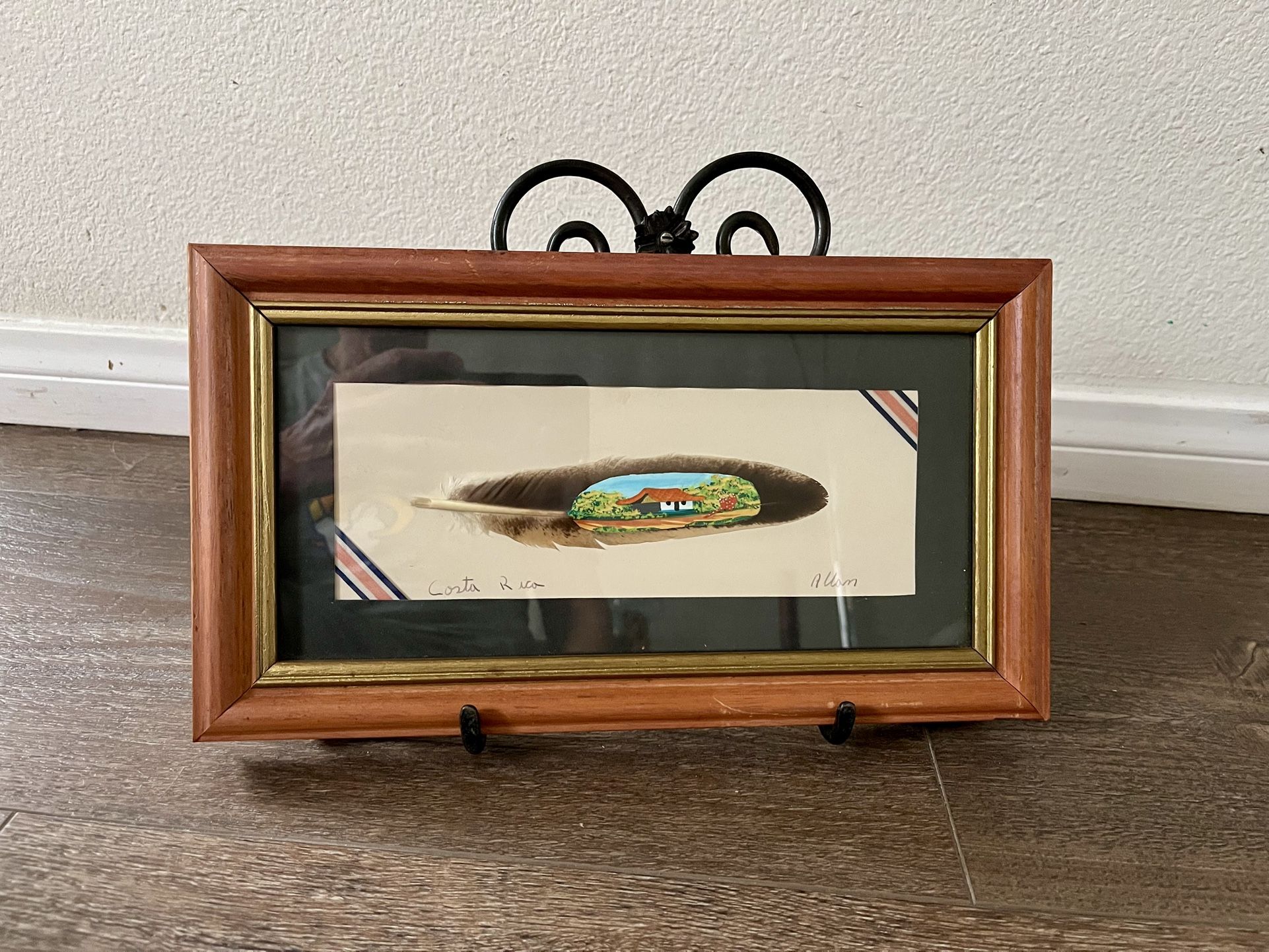 Framed Costa Rica Artwork with Wooden Frame hand painted on Bird Feather 7/13 in