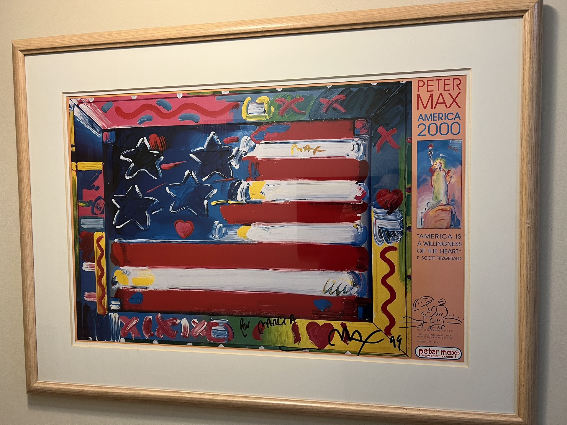 Peter Max, America 2000. Frame is about 47” wide by 37” tall. Signature is “For Marcia” and includes a small doodle.