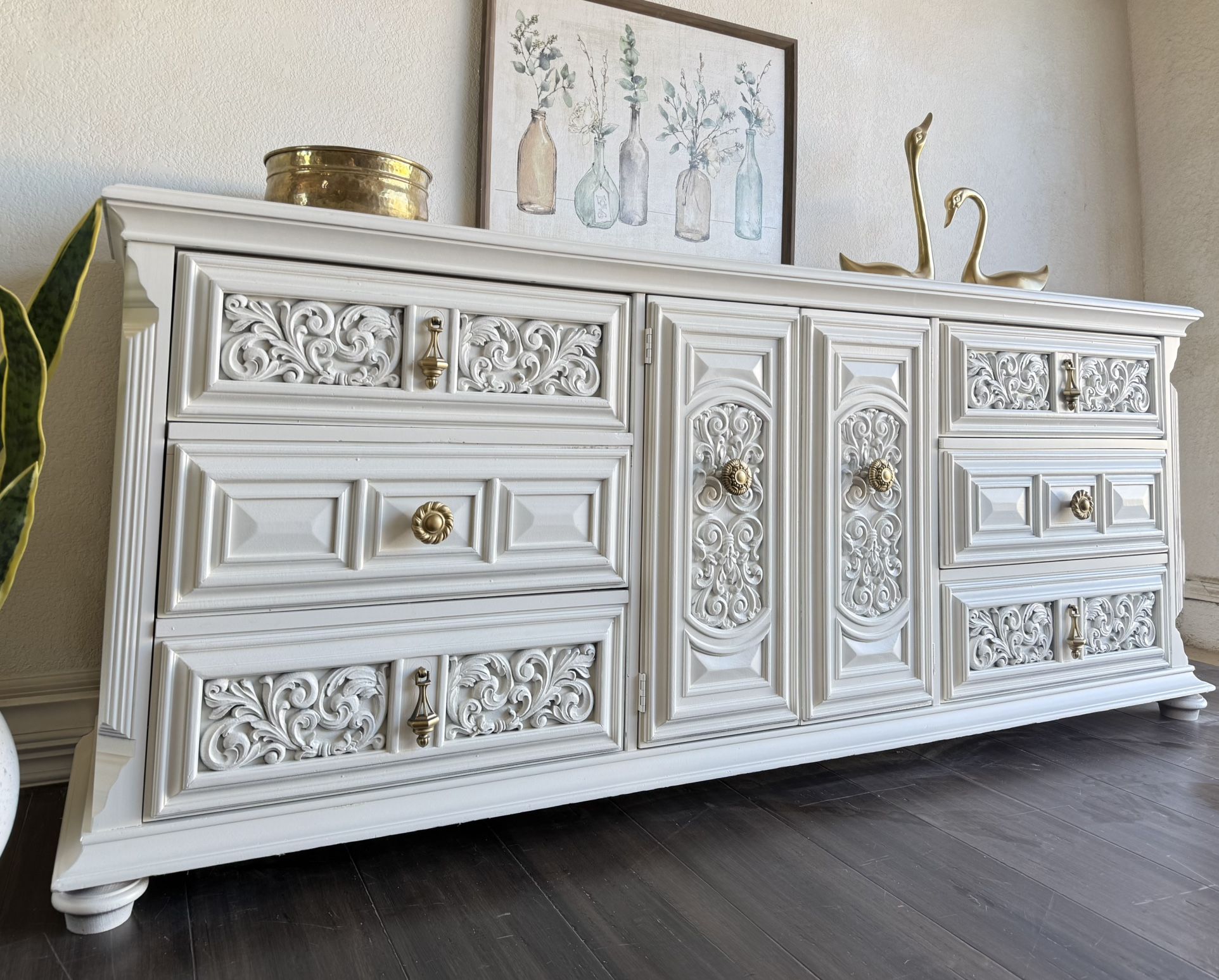 Gorgeous Cream XL Unique Dresser Credenza or Entry way Piece Delivery available Measures: 78.5W 19D 32T Beautiful and very intricately made XL statement piece ! Drawers are solid wood and dovetailed. This piece is extremely heavy and very well made. Entire piece is sealed with multiple coats of Polycrylic that will not yellow over time.