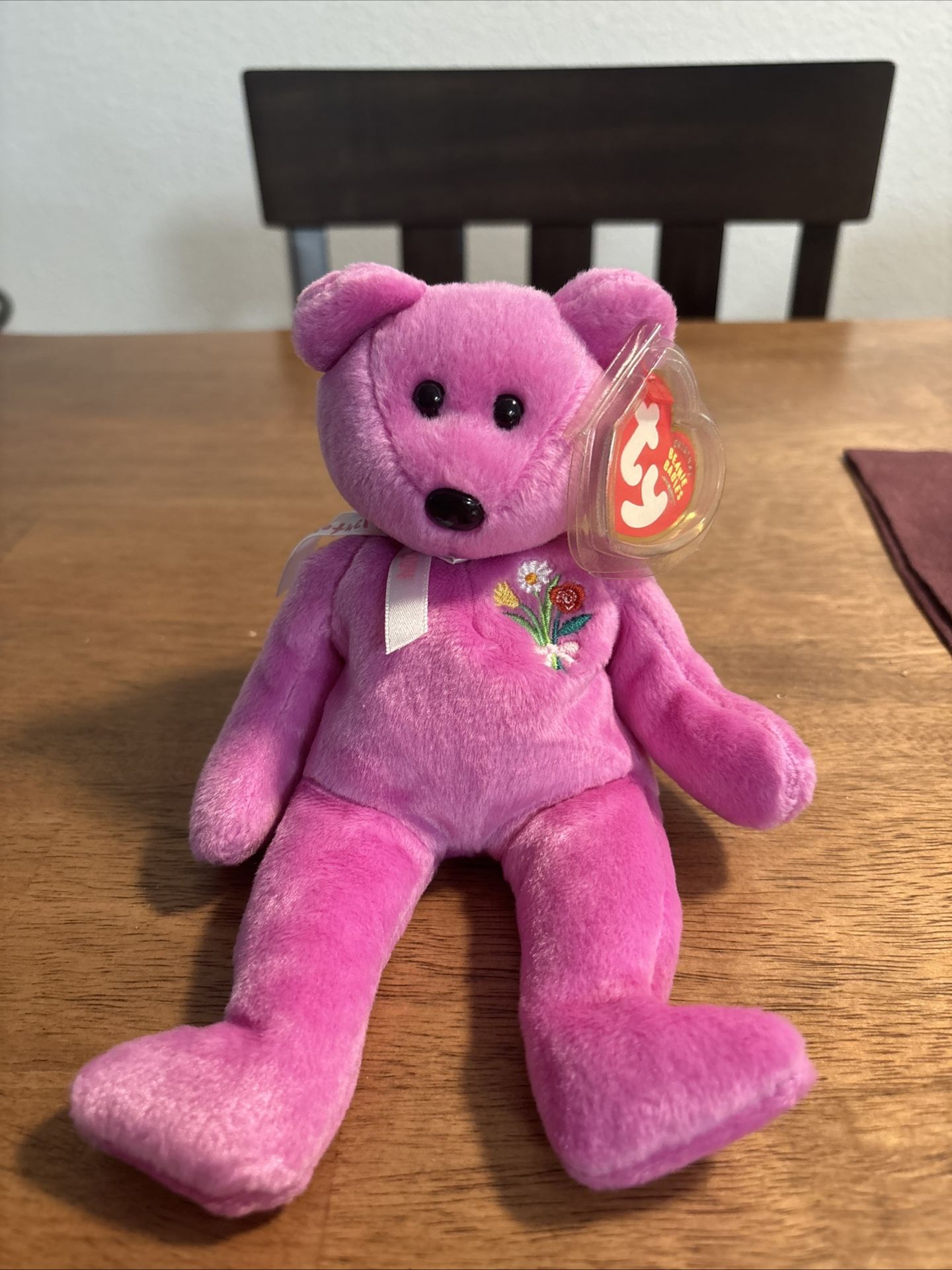 This product is a rare and collectible Ty Beanie Baby teddy bear from 2004, designed specifically for Mother's Day. The plush toy is in mint condition, with tags, and features a beautiful pink color. As a retired item, it holds sentimental value for collectors of Beanie Babies. Perfect for gifting to a mother or adding to a teddy bear collection.