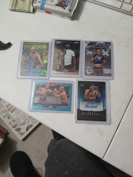 Upgraded, mint/near mint, all in top loaders. Stadium Club Chrome- Jon Jones Topps Finest Insert- Christian Duncan Topps Chrome- Alex Pereira Topps Finest- Tatiana Suarez Topps Certified Autograph Issue- Aiemann Zahari