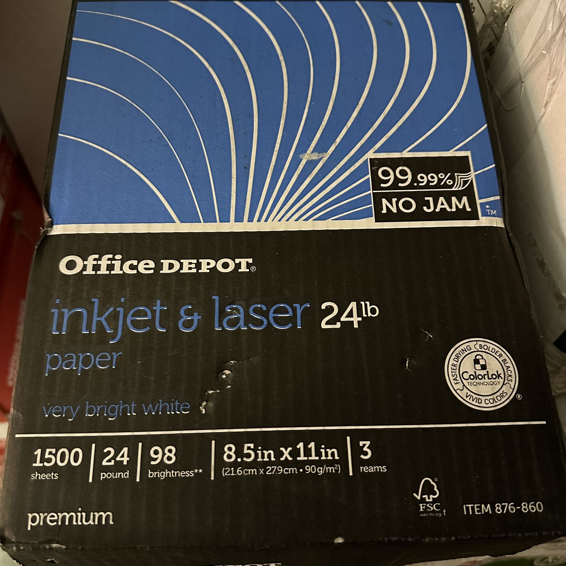 1500 sheets total (3 reams) 8.5×11 inch • 24 lb • 98 brightness Office Depot Premium Inkjet & Laser Paper Very bright white, smooth, and suitable for all printers. High-quality paper with 99.99% jam-free performance and ColorLok Technology for vivid colors and sharp black text. Perfect for: • Home office • School printing • Business documents • Everyday use 📦 I also have other types of paper available
