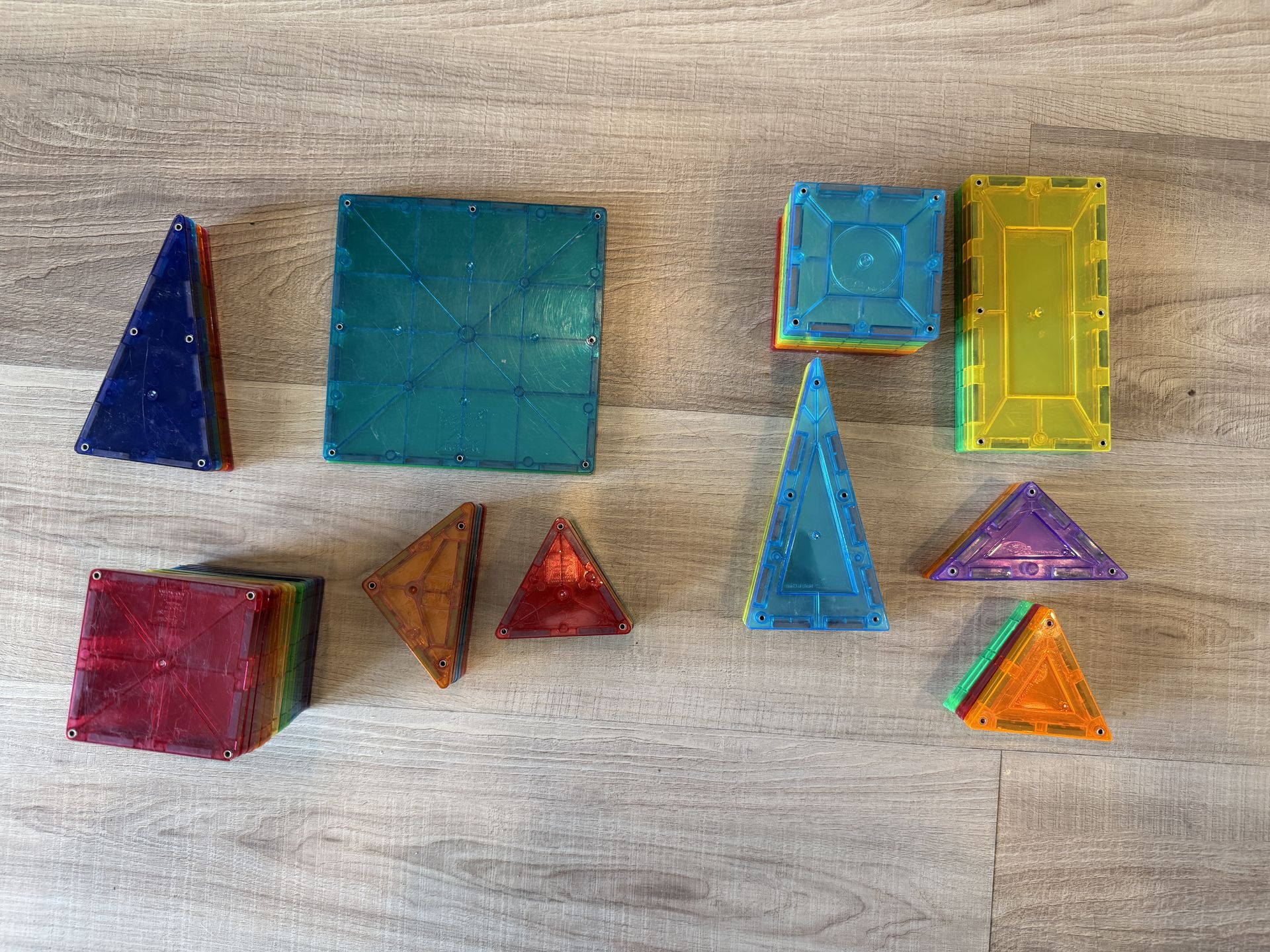 Used magnetic tiles. 2 brands, Magna-tiles & CraZArt magnetic tiles. Magna-tiles- has 37 pieces CraZArt magnetic tiles- has 24 pieces They still have strong magnet connections! Scratches from play. My children did NOT play with these in water. Will not separate. Porch pickup. Cash ONLY. Smoke free home. Cat friendly home.