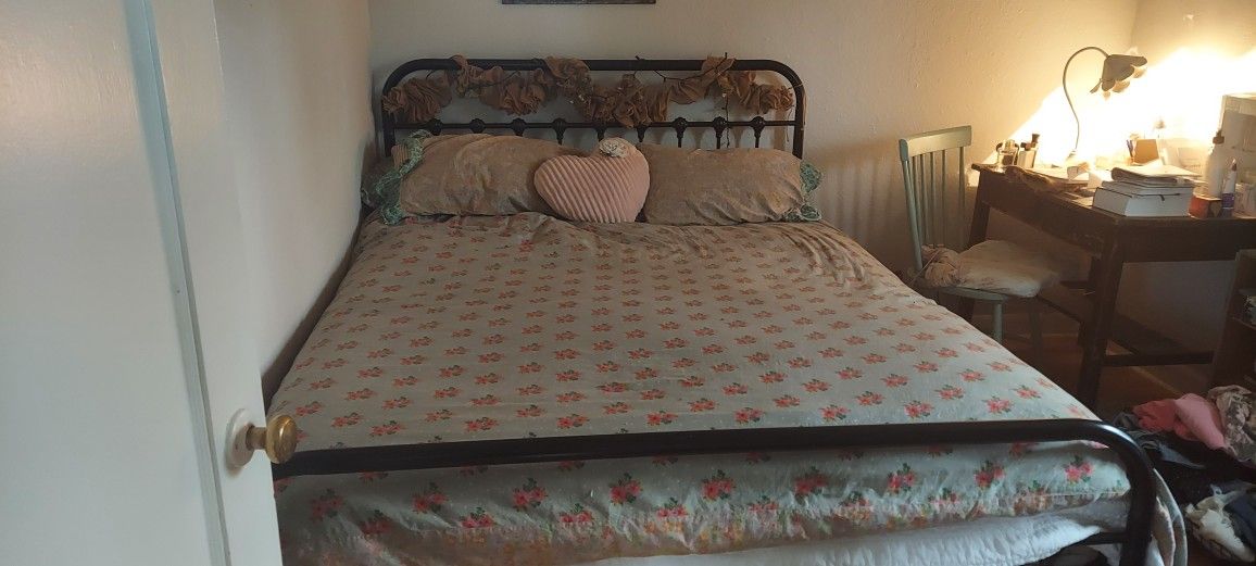 Black metal queen frame. Mattress is used but free if you want it