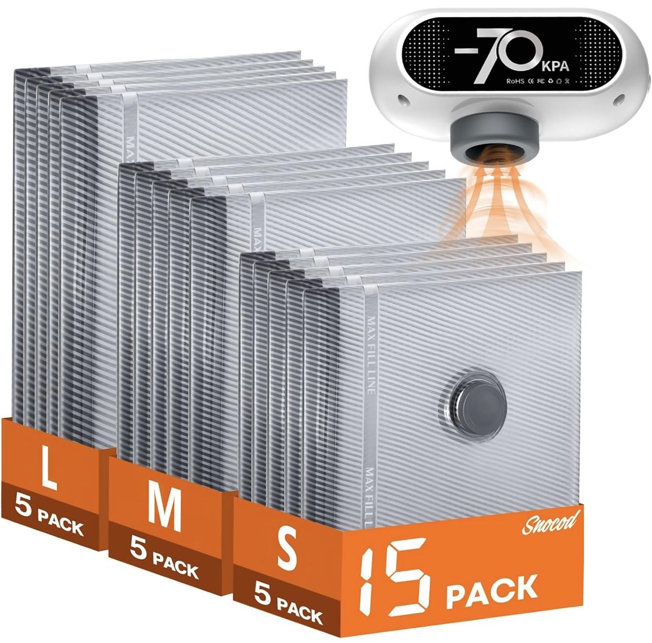 15 Pack Vacuum Seal Bags for Clothing Travel with -70KPa Electric Pump, Space Saver Storage, Reusable Vacuum Bags with Pump, Heavy Duty for Travel, Wh