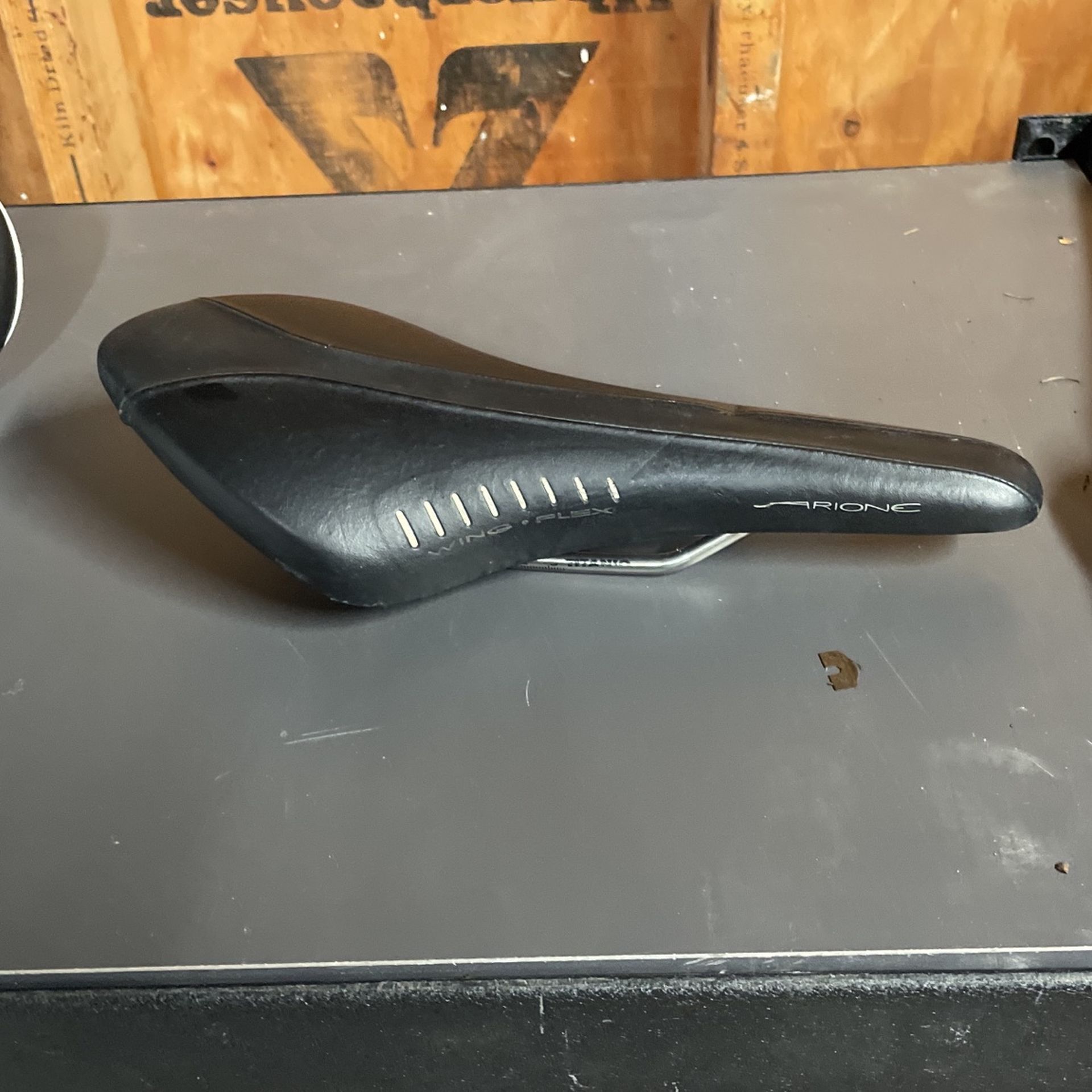 Road Bike saddle handmade in Italy. $130 new. The Arione Classic retains the shape of first Arione saddle, with a slightly longer, thinner nose, wider wings and higher profile compared to the new Arione, but maintaining the overall length and width dimensions. With the Wing Flex technology – which enables flexibility where your thighs meet the saddle – and alloy Kium rails for light weight, it's a contemporary saddles for those riders who know just what they want.