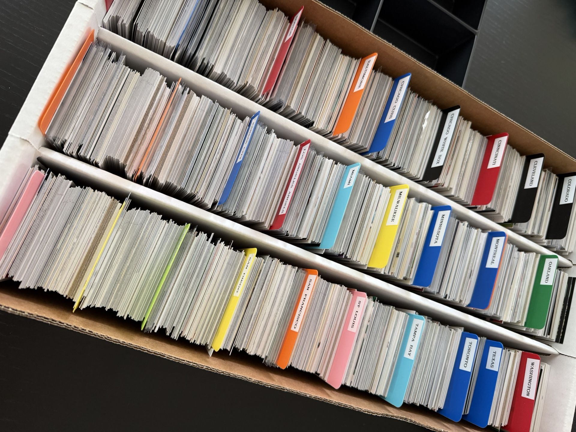 Local pickup only Organized by most teams - does NOT include Dodgers or Yankees Mixed later year cards varying from all card companies like Topps, Donruss, Prizm All top tier players have been removed but there could be some that I missed Some rookies included, a few 80s or 90s vintage, But mainly 00s to now Great for starting out - 18"L x 4.38"W x 10"H and has up to 3000 cards. I didn’t count the cards, but that’s the max capacity of the box ,and it’s pretty full.