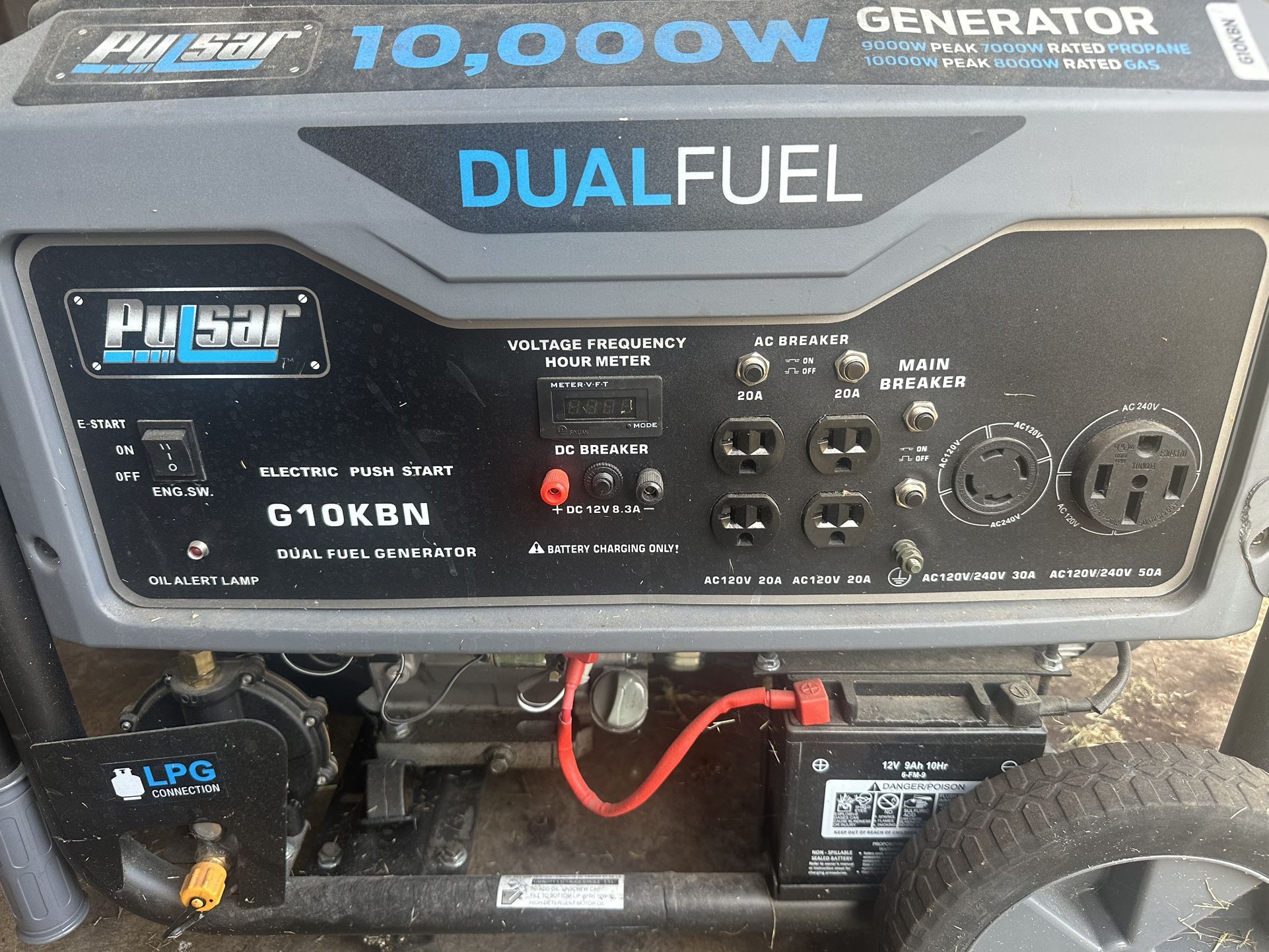 Lightly used Pulsar 10000 Watt Dual Fuel generator. Propane or gas powered. Electric push start. More specs in pictures.