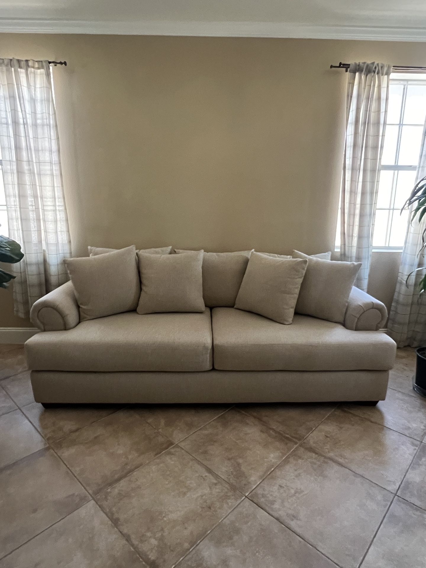 Like new, rarely used three piece sofa set in beige. No stains, wear or tears. Bought new for over $2500 plus tax. 96"W x 45"D x 40"H - dimensions for large sofa, additional love seat and one seat.