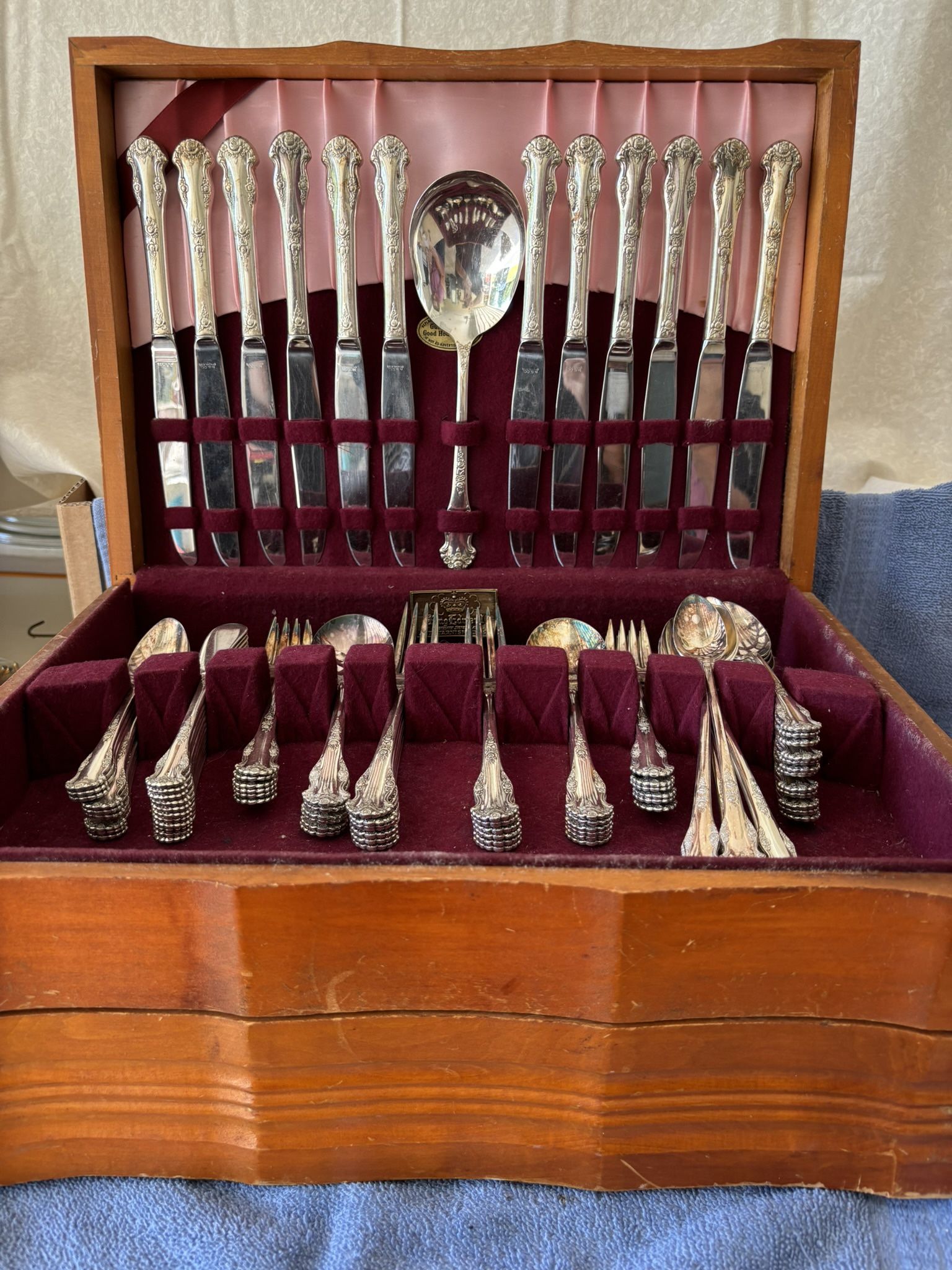 1. Pattern/Brand • The paperwork identifies this as “King Edward” Exquisite Silverplate by the National Silver Company. • This pattern was popular in the mid-20th century (roughly 1936–1960s). 2. Composition • This is silverplate, not sterling. That means a thin layer of silver is plated over a base metal (often nickel-silver). • The guarantee notes that knife blades are “stainless” and not silverplate. 3. Storage Chest • The set comes in a fitted wooden storage chest with a velvet interior. These chests were often sold with the sets. 4. Contents (what I can see) • At least 8 place settings (knives, forks, teaspoons). • Several serving pieces (soup spoon/ladle, serving spoons, etc.).