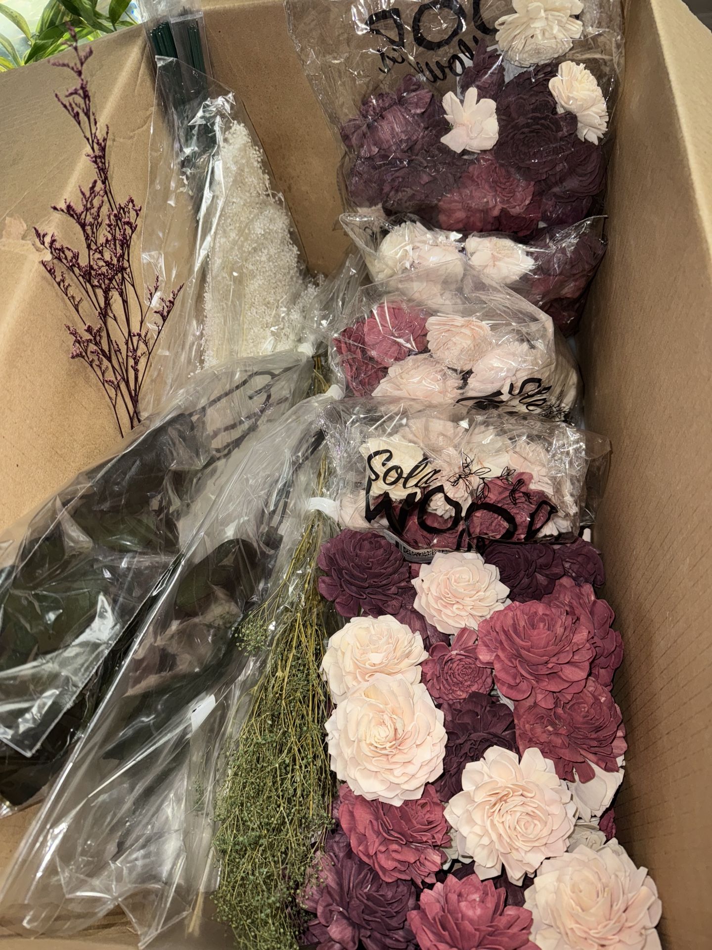 Sola Wood Flowers roughly 175 (large, medium and small assortment), comes with x3 baby’s breath, and x1 green broom bloom and x2 green salal preserved leaves, the green floral wires to attach to flowers if needed and a few hot glue sticks