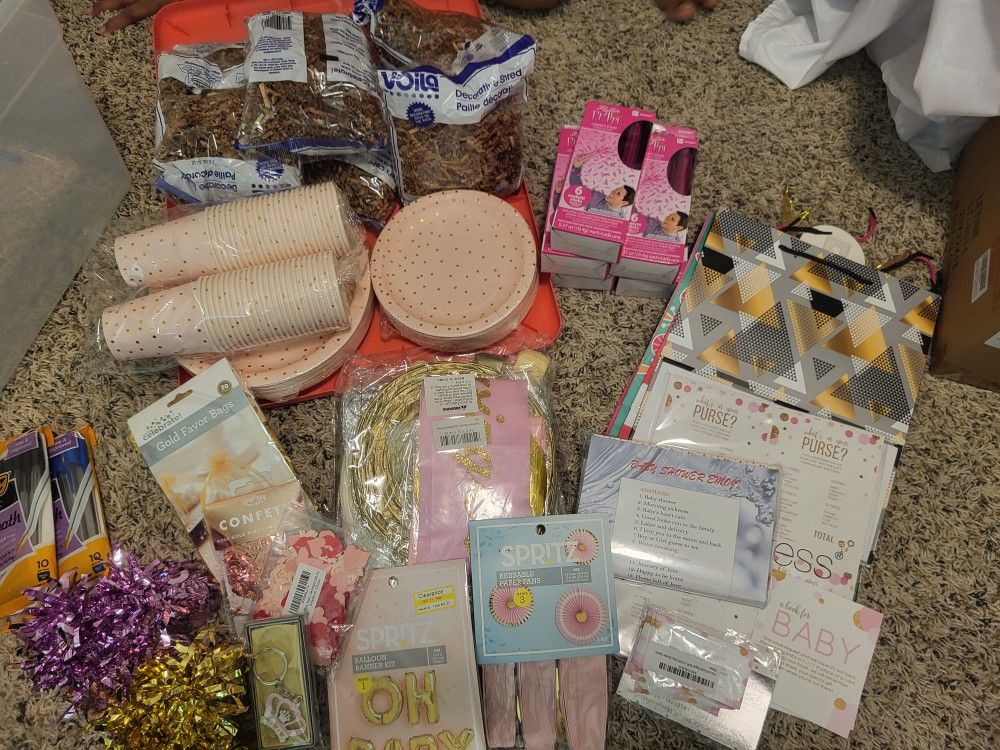 New: open but never used 40-Baby Shower Emoji cards w/answer sheet 50-Baby Shower Diaper Raffle cards 8-A Book for Baby cards, goes with pink invitations 20-Whats in your Purse cards 30-Gold Favor Bags 3-Misc medium gif bags 1-3 piece Spritz Paper Fans 10-Pink & gold hanging lanterns (3 were used) 1-Spirtz "Oh Baby" balloon banner 1-Pink Key chain (princess) Rose gold, pink, and red confetti 5-6pk confetti sticks 3-Gold balloon weights 3-Pink balloon weights 1-Pink w/gold polka-dot plates (about 50) 1-Pink w/gold polka-dot small plates (about 50) 1-Pink w/gold polka-dot drinking cups (about 50) 6-Brown Decorative Shred 3-Shrink wrap w/bow Used Bic Black & Blue Pens