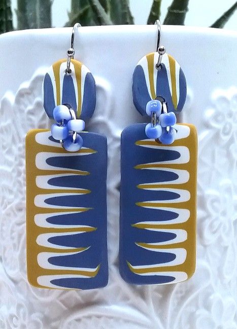 These wonderful hand Crafted Polymer clay Boho Beauties by RozzArtDesigns, make a modern statement in a striking combination of denim blue and mustard yellow. Little blue striped Czech beads were added for a delightful accent. They are super swingy and light weight. Suspended from surgical stainless steel French hooks They are sturdy, and flexible..but do not "test" bend them. You may cause breakage. I've made them nice and light. Just treat them kindly and store them in their box. They will be just fine. 🥰 Store policy.. and FAQ All items are very sturdy, well packed and will not be broken when They arrive. If a RozzArtDesigns item is handled roughly, it can break.. I cannot be responsible for returns. It is polymer clay. Please store your items in a box. Not in your purse.. 🥰 Do not shower or swim in them. Apply lotions, hairspray & perfumes BEFORE you put on your jewelry. If they get make-up on them wipe them gently with a baby wipe. They will last for years if treated with the love and respect I put into them. Thank you so much Peace and blessings Always Rozz.