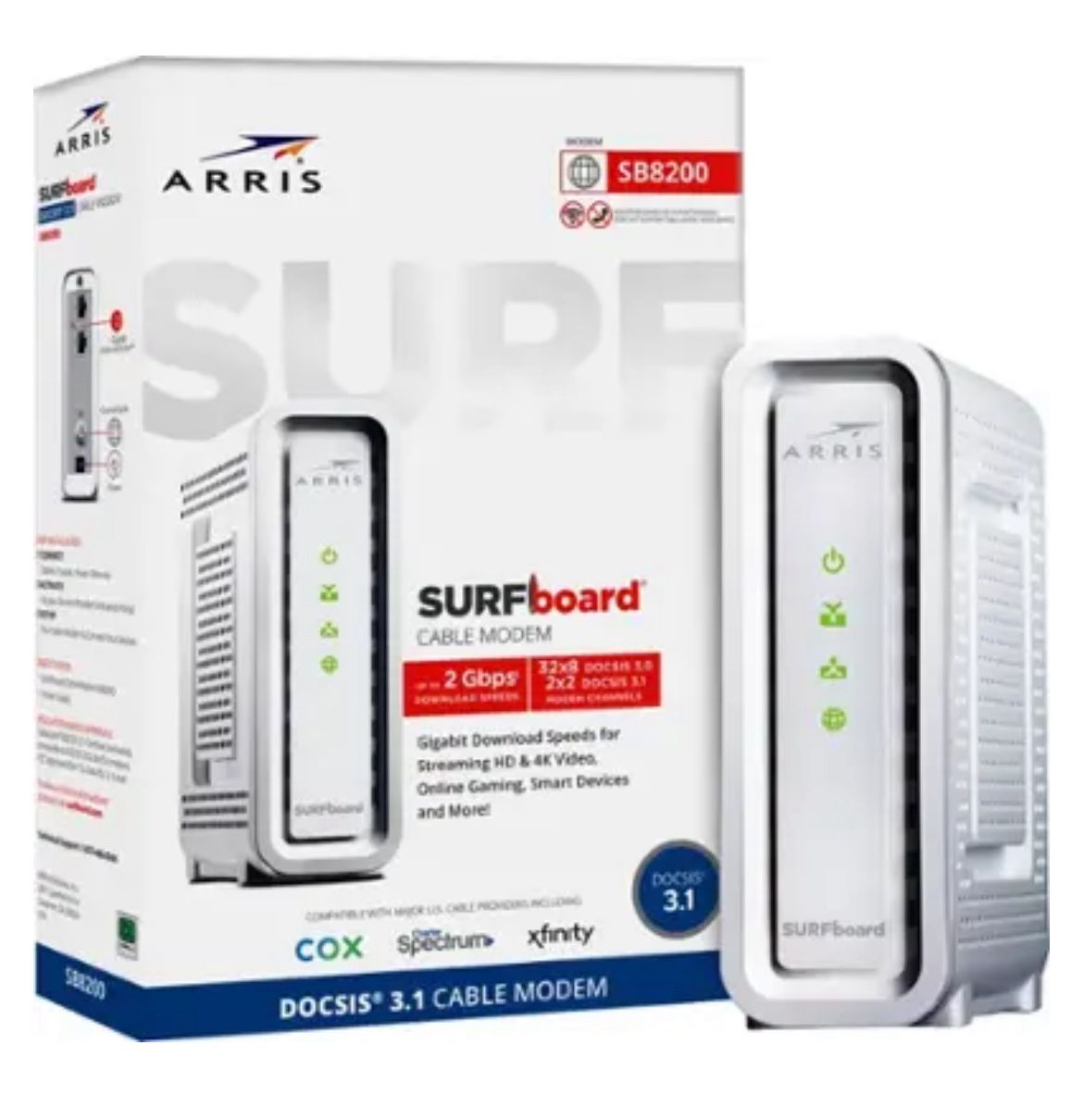 ARRIS SURFboard SB8200 DOCSIS 3.1 Cable Modem is capable of delivering true Gigabit speeds. Approved for use with Cox, Spectrum, Xfinity and others supporting cable internet speed plans up to 1 Gbps with two 1-Gigabit Ethernet ports. DOCSIS 3.1 technology Features 32 x 8 channel bonding in DOCSIS 3.0 mode, or 2x2 OFDM in DOCSIS 3.1 mode, which is 10x faster than DOCSIS 3.0, provides enhanced security features, reduces lag while gaming and supports Gigabit speeds. Works with any Wi-Fi Router Using one of the Ethernet ports, connect to any Wi-Fi Router to share the high-speed internet connection around your home. Save on monthly rental fees Stop paying rental fees to your service provider. When you purchase this modem, you can save up to $168 per year in rental fees. Compatible with major U.S. Cable Internet Providers Approved for use with Cox, Spectrum, Xfinity and others. What's Included SB8200 Cable Modem Power Supply, Ethernet Cable Support Information Card Quick Start Guide Manuals & Guides