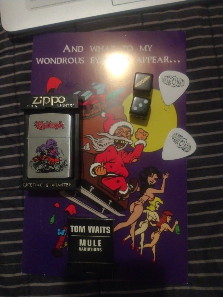 Extremely rare vintage Epitaph Records Zippo. New and unused $100 for a piece of SoCal Punk history. Classic rare punk extras included. Punk-O-Rama Fender guitar picks, unused Epitaph Xmas card, Punk-O-Rama dice, and Tom Waits Mule book of matches included. Great gift for any punk fan