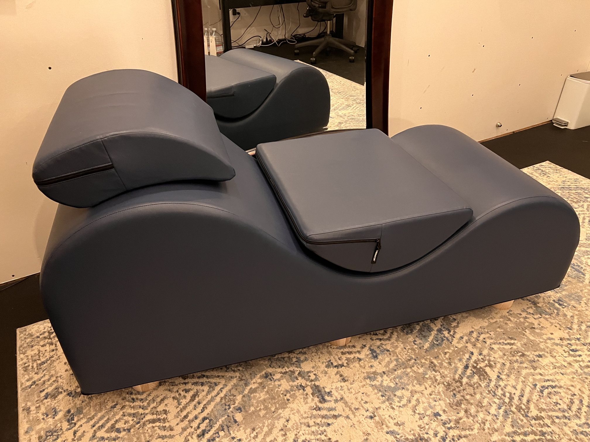 Brand new and doesn’t fit size of room, unable to return. Complete with cushions that transform it into flat top (as pictured). Premium SynLeather™ – Wrapped in buttery soft synthetic leather, its breathable, natural-grain finish is stain-resistant, antimicrobial, easily wipes clean, and feels fantastic. Elevated Design – The Esse II offers a wider profile and includes a matching mini-scoop for added support. Luxury Meets Leverage – Firm high-density foam and solid wood feet. The Esse II is a striking evolution of our iconic chaise, now reimagined with premium elevation, smooth SynLeather. With carved curves, graceful slopes, and lathe-turned wooden feet, these sculptural loungers don't just look stunning - they transform your room into living art. Enjoy full-bodied support and an additional mini-scoop with the Esse II that features a removable headrest that double as positioning pillows. $950 new / asking $700