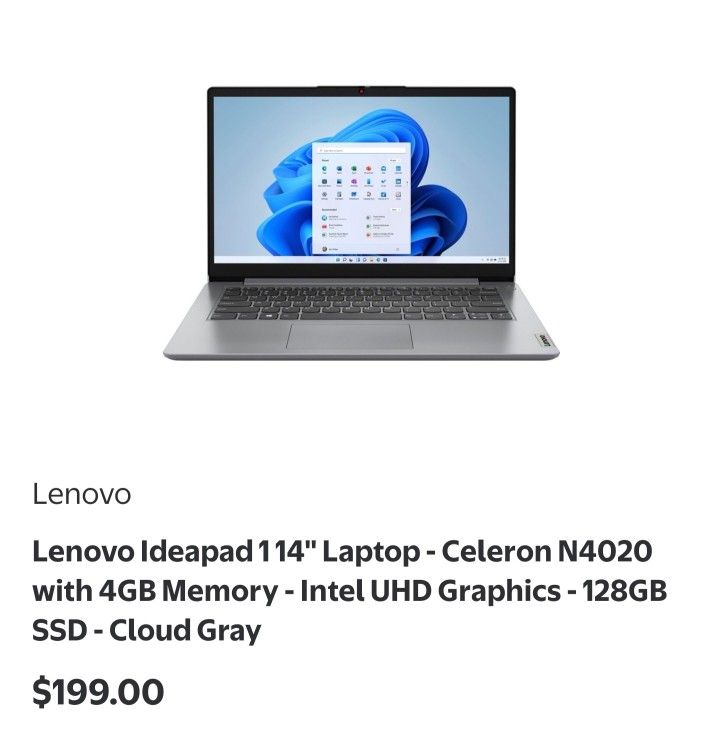 Lenovo Ideapad 1, 14" Laptop - Celeron N4020 Intel UHD Graphics -128GB SSD Windows 11 pro pre installed Light weight and portable Cloud Grey