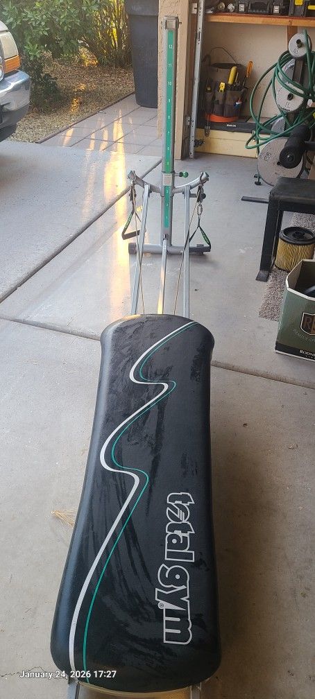 Chuck Norris total gym work out machine. adjustable height and resistance comes with all the accessories , tools , owners , manuals, and videos. Only used for a couple of months. One rubber cap is missing see photos. It does not affect the function of the machine. Discounted to sell