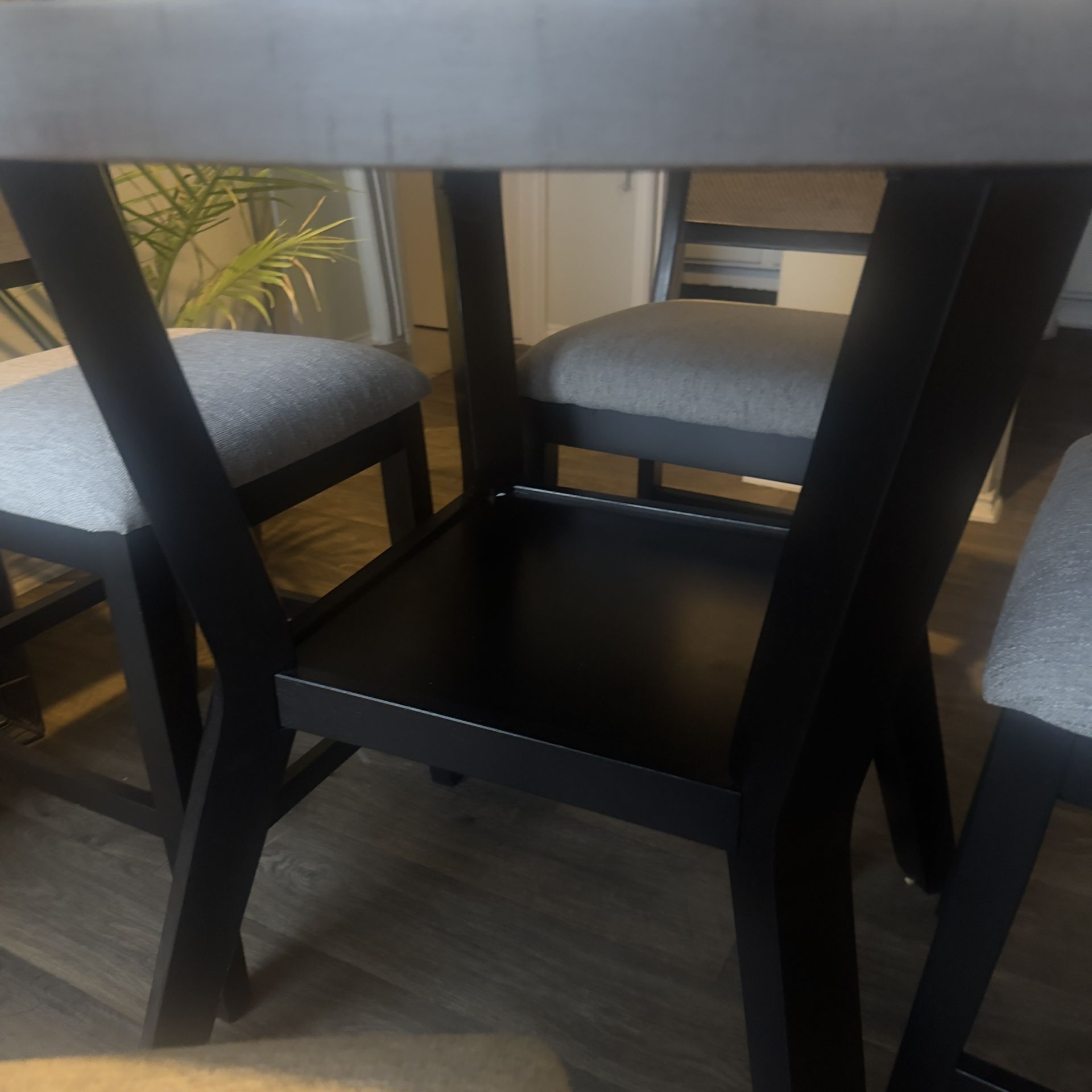Grey with black trim 5 chairs Table with shelf space underneath table