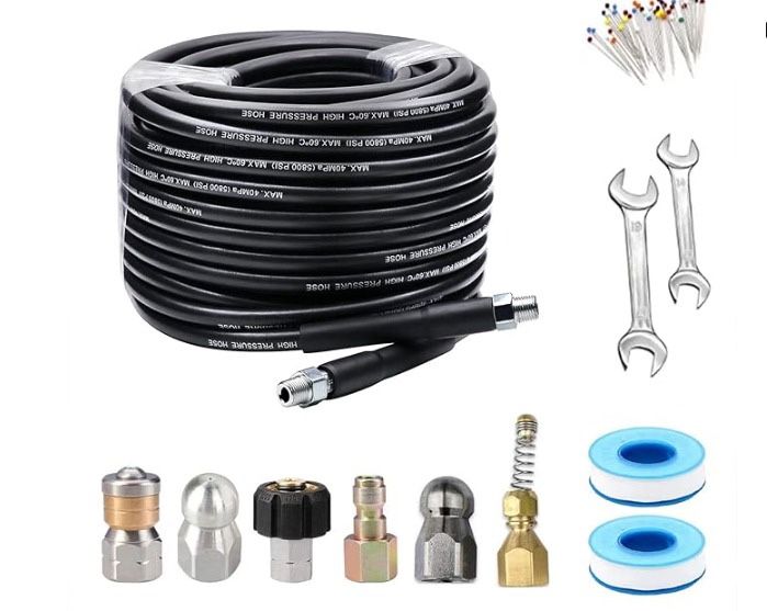 50FT Sewer Jetter Kit for Pressure Washer,Sewer Jetter Nozzles Kit,Drain Cleaning Hose, Rotating and Button Nose Sewer Jetting Nozzle,1/4 Inch NPT, Pearl Corsage Pin 5800 PSI