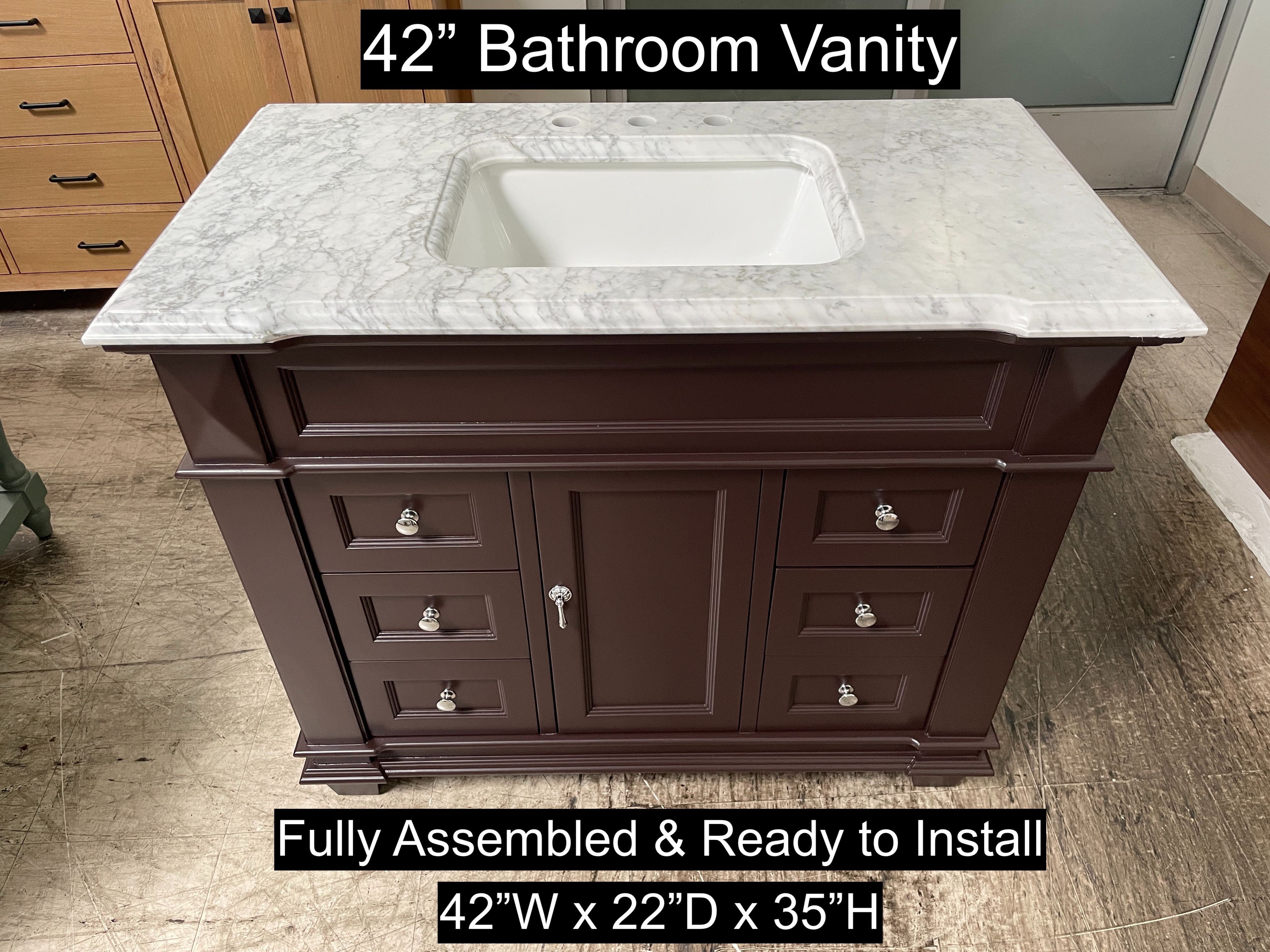 *42” Bathroom Vanity *Fully assembled and ready to install! *Open-box item, imperfections, sold as-is *Genuine Carrara marble countertop, sourced from Italy *Solid wood frame, doors, and drawers *Dovetail drawers with soft-close tracks and door hinges *Back is open for plumbing *Dimensions: 42” W x 22” D x 35” H *Price listed plus 10.25% sales tax *Cash and pick up only *Join us M-F 8am – 5pm *Our showroom has 100’s of vanities in multiple styles, colors, and sizes! *We also have mirrors, medicine cabinets, kitchen islands, and patio furniture! * For more information, please call (310) 320-8882