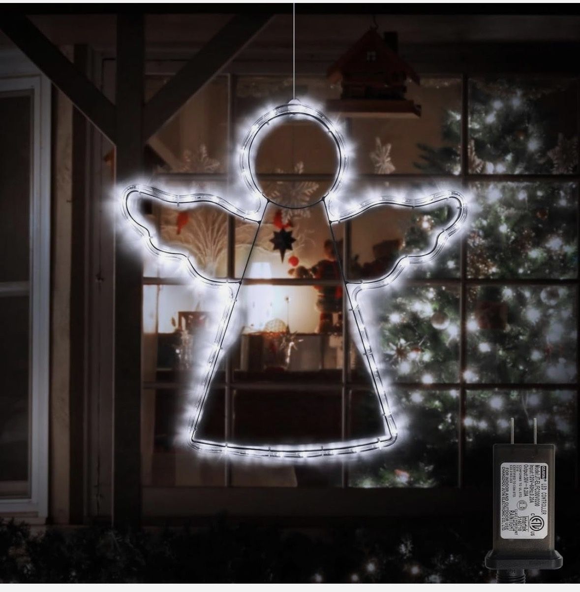 19”Light Up Memorial Sign Angel: Clear white LED big angel neon signs lights with mains powered timer built in outdoor waterproof Christmas tree topper lights,remember one's loved ones ornament for deceased loved one,light up angel outdoor decorations for roof window wall tree. Measuring 19" x 19" Giant Glorious LED Angel Lights: The large lighted angel outdoor PVC outdoor sympathy lighted angel wrapped around a sturdy metal frame to create the “Angel” Lights, withstand all kinds of weather, like winds, snowy, rainy, IP67 Waterproof applicable. ( Keep the plug from moisture). Timer Built In Light Up Angel Outdoor: Press the button on the plug till the warm white light is on. The timer will be activated for lights up 6 hours and 18 hours off.