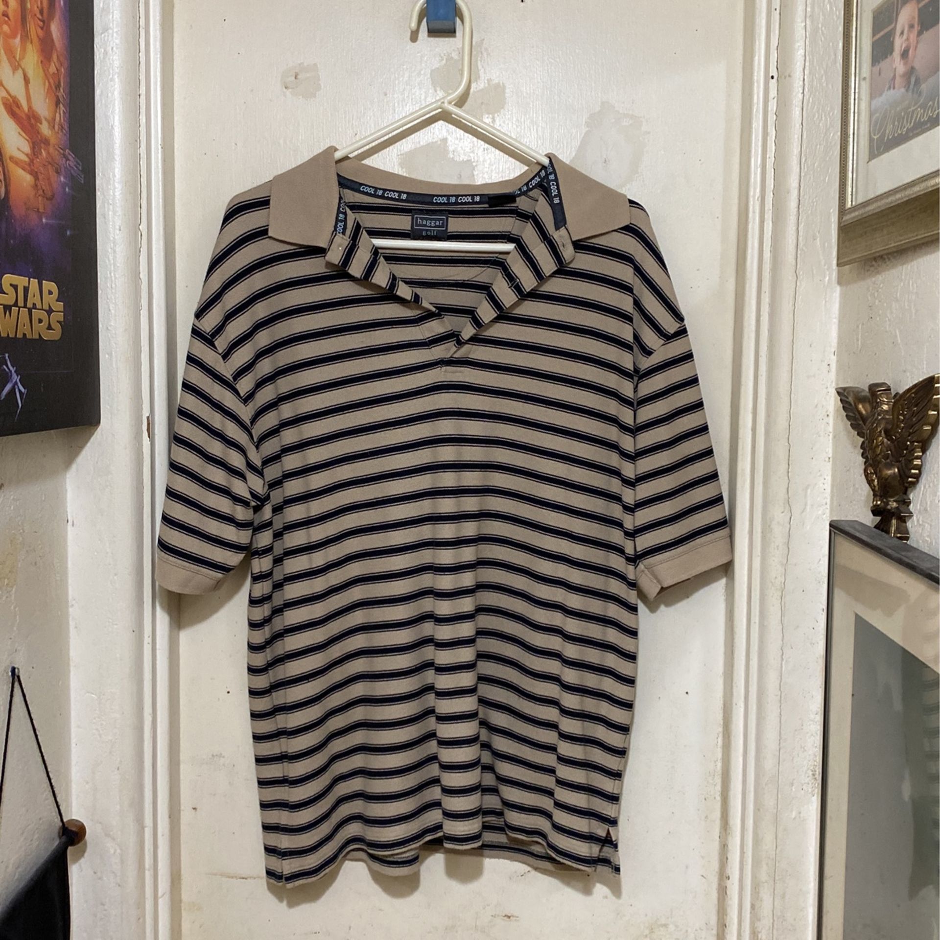 Haggar golf men’s polo shirt three buttons 100% cotton says cool 18 which means it’s cooler than normal shirt so you won’t sweat so much. The bottom of the sleeves has a tan cuff very good condition looks like never worn no holes no spots.