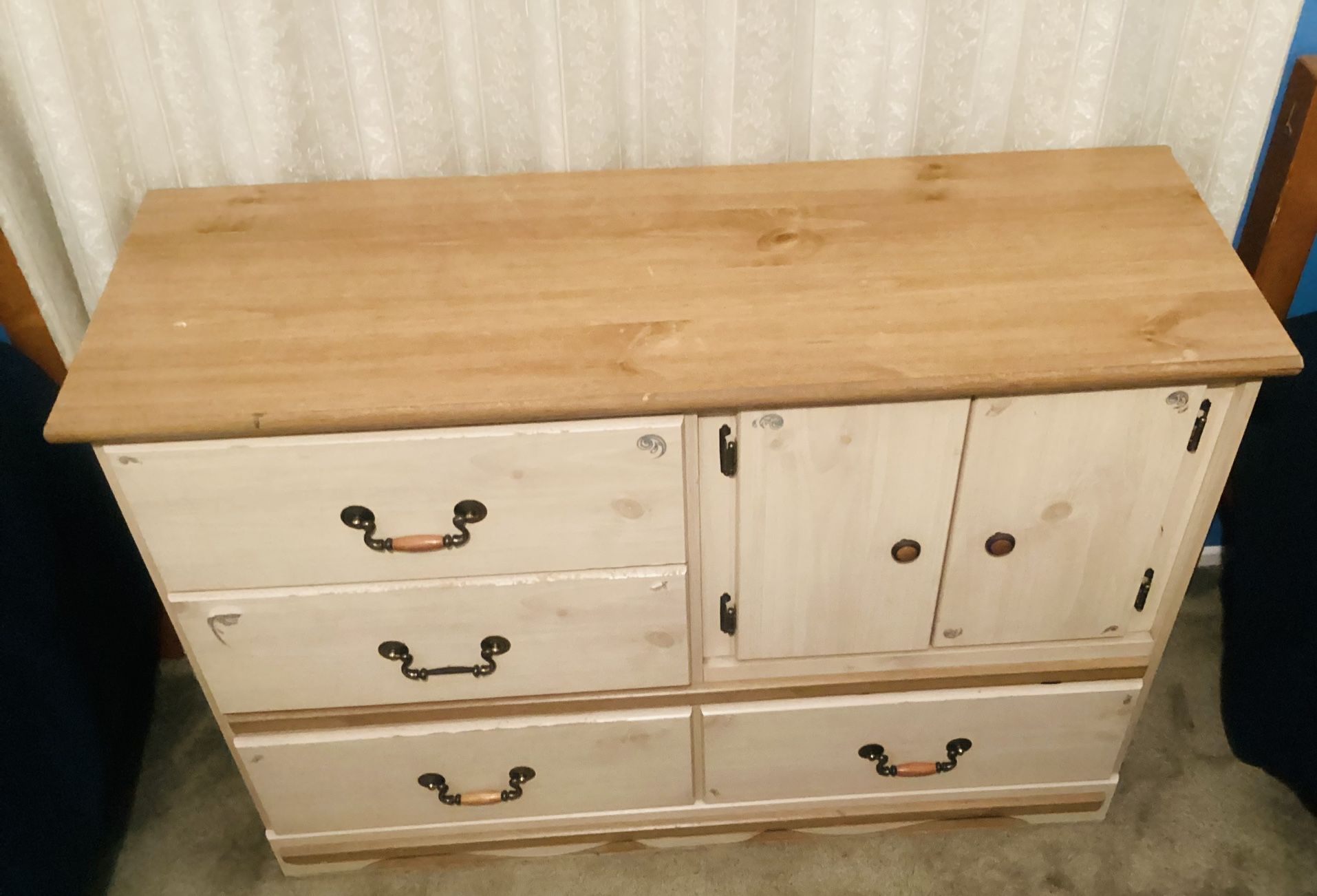 Wood Dresser – Mixed Storage & Natural Charm This solid wood dresser offers both style and function with a natural finish and versatile storage layout. Featuring four smooth-gliding drawers with metal handles and wooden grips, plus two cabinet doors with round knobs, it’s perfect for organizing clothing, linens, or household items. 46in wide 32in high