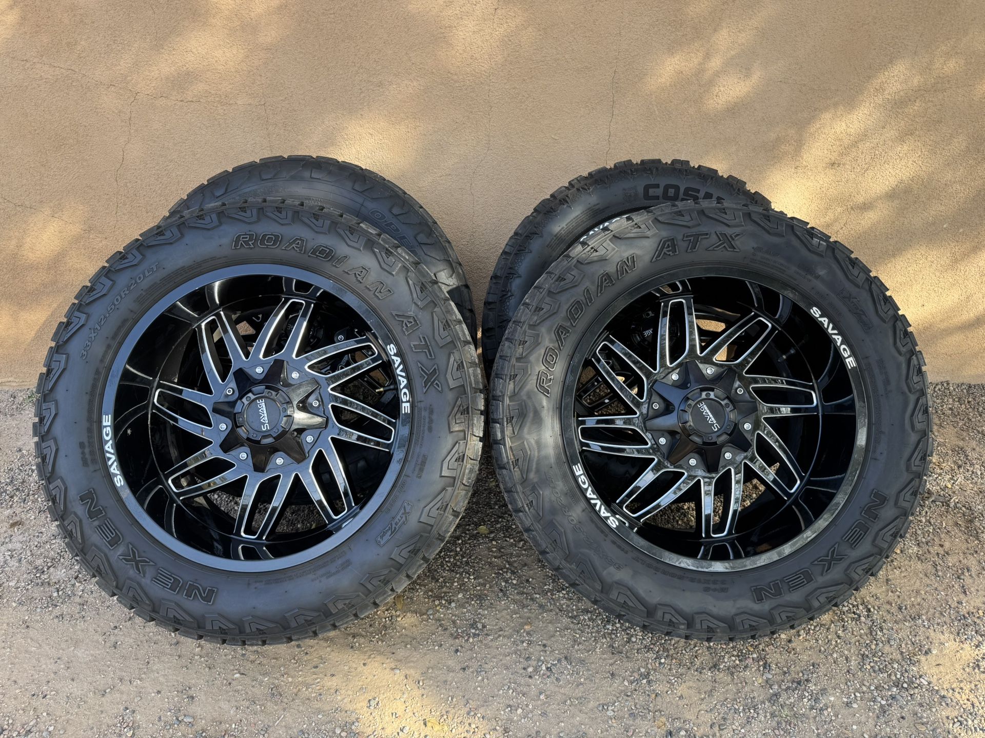 Looking for a last minute Christmas gift? 20x12 Savage Rims -44 Offset All Center Caps! No Curbies! No Rash! 33x12.50 Tires! Very Good Tread! 2 Different Bolt Patterns Ford 6x135mm Chevy 6x139.7mm GMC 6x139.7mm $1,200 Bucks OBO