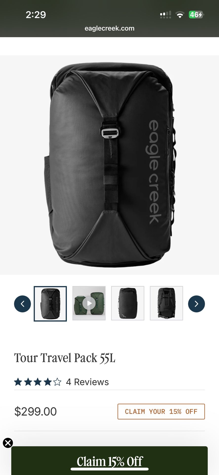Eagle Creek Tour Travel Pack 55L in black.