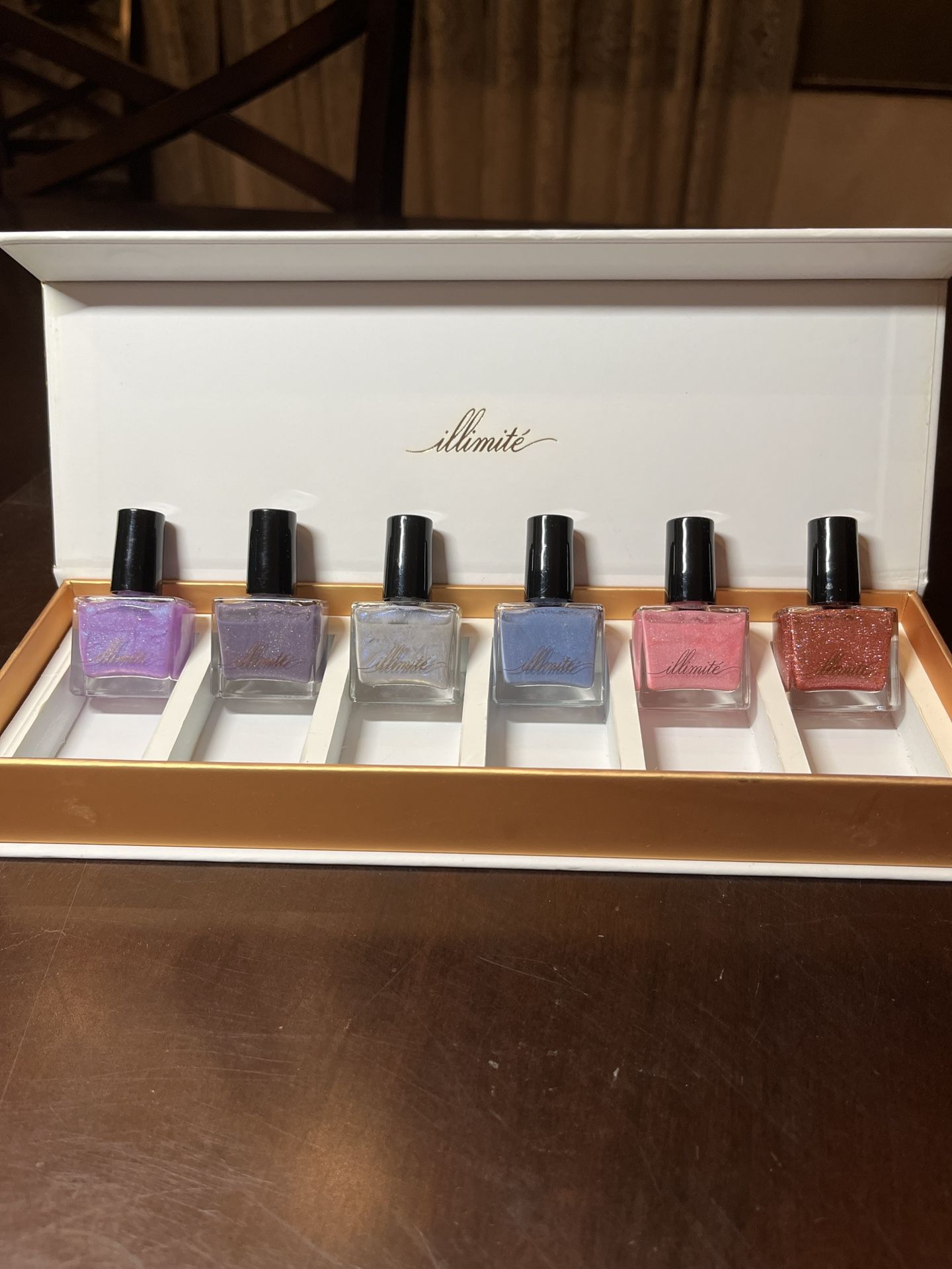 đŸ’…illimite Nail Polish boxed set High quality limited edition NEW Lavender, Dusty Violet, Silver Denim Blue, Pink, Rose Gold glitter By Live Love Polish Set of 6 bottles boxed set Original retail $95
