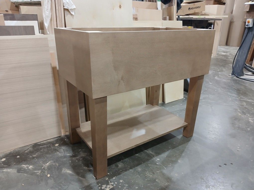 Custom bathroom vanity cabinet, 36" wide, 21" deep, 33" tall. Light brown stain on maple wood. Solid Maple tapered legs, maple veneer surround. Granite countertop would look amazing. $260 brand new from cabinet shop