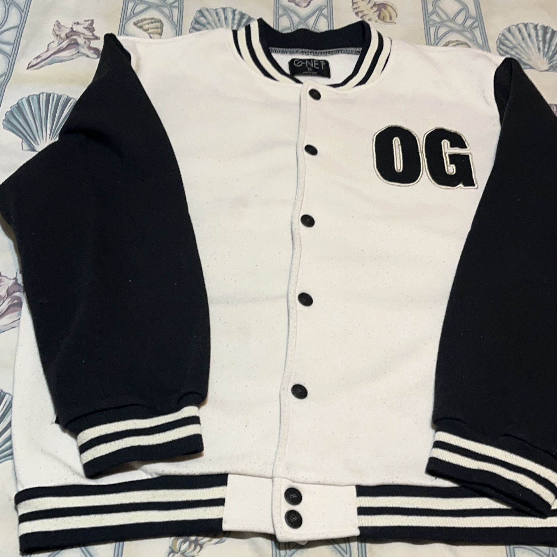 Send me an offer PLEASE🫶🏾 Classic varsity jacket with OG lettering patch, black sleeves, white body, striped ribbing, and button closure.