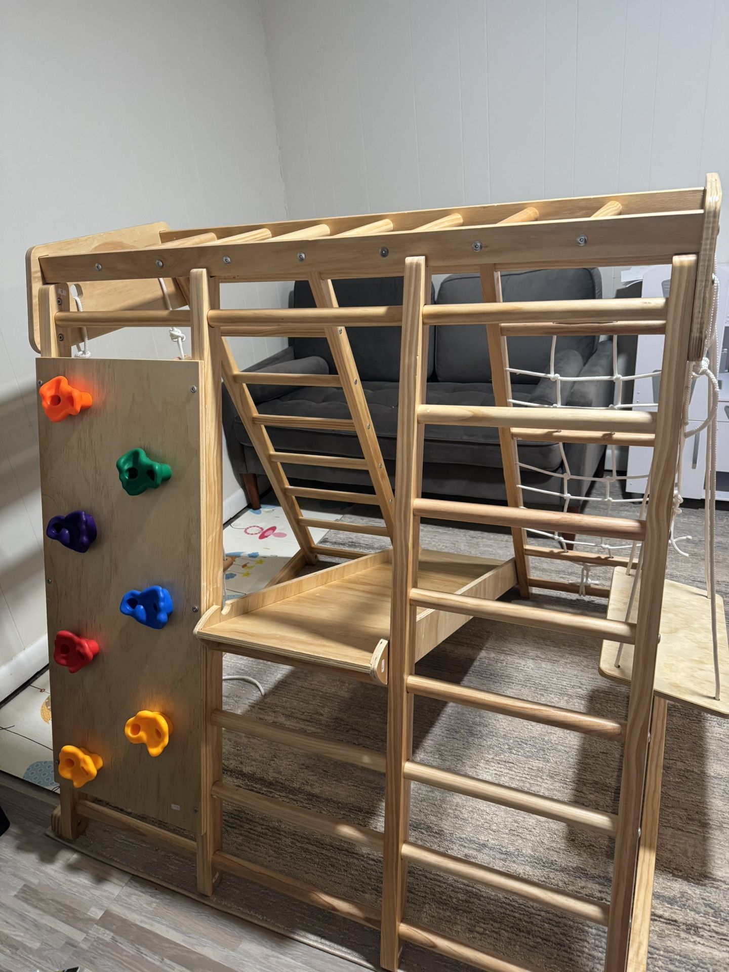 Sells for 299.00 on Amazon. 47x43x47 Color: Natural Wood Condition: Like new Indoor Playground 7-in-1 Jungle Gym Playset for Kids 2-6yrs - Slide, Climbing Wall, Rope Wall Climber, Monkey Bars, Swing - Waldorf and Montessori Style Wooden Climb Set.