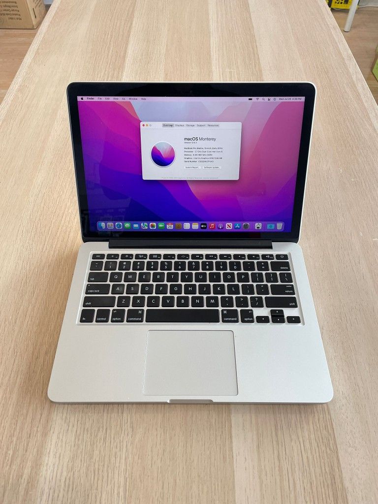 Hi I am selling Apple Macbook Pro 13”, Early 2015, Retina Display. I factory reset it, so it's like new and all accounts and data is removed. It is fully functional. You can come and test it out, no issues. It is in excellent condition. This is perfect for Photo editing, Video Editing, Audio recording, graphic designing as well for students, work, and home. Battery is good. It will come with charger Specs: MacOS Monterey 12.6 2.7 GHz Intel Core i5 processor 8 GB Memory DDR3 500 GB Flash Storage Intel Iris 6100 1536MB Graphics Bluetooth// WiFi// iMessages // FaceTime Two USB Port// Two Thunderbolt Port// HDMI Port // Sd card slot// 3.5mm headphone port. If you have any questions you can contact me. Thank you