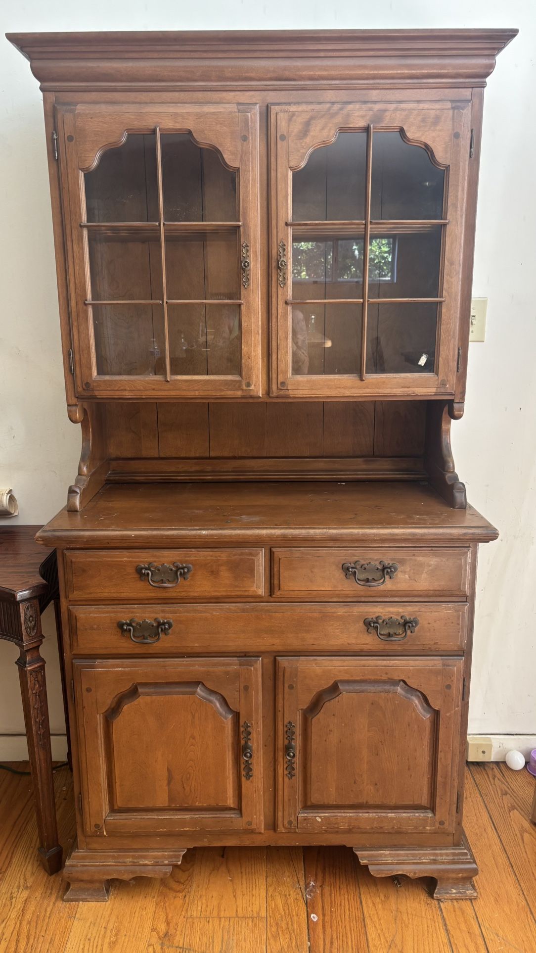 Beautiful wooden antique cabinet. 5 drawers, 2 cabinets underneath and one on top with glass doors. Has been in my family for generations but im moving and can’t take it with me 40” wide 73” tall (comes apart in half ) 19” deep