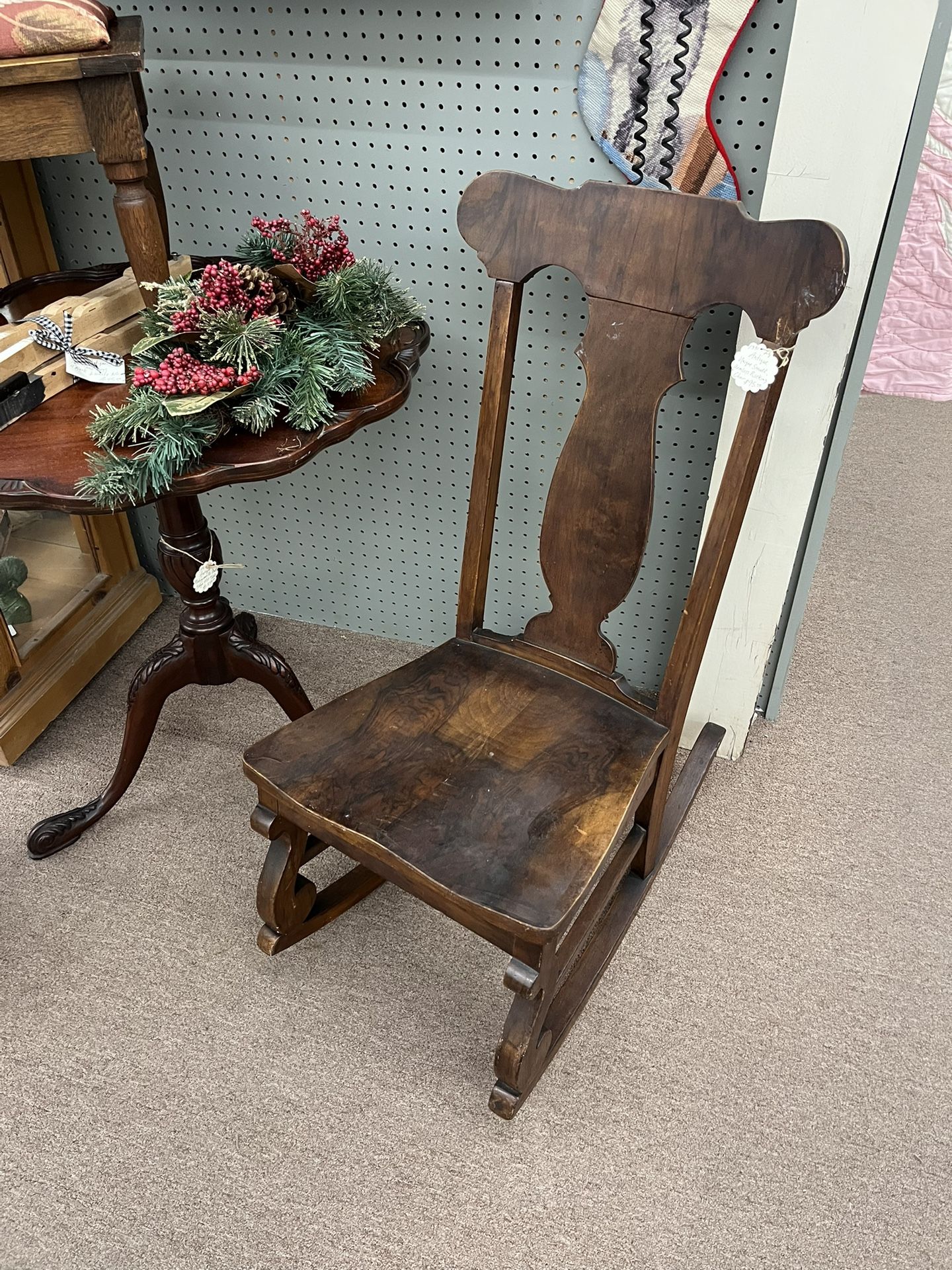Small armless wooden unique rocking chair. This can be found in booth EF. See photos for location and other info. Measures about 15 inches from the floor to the seat.