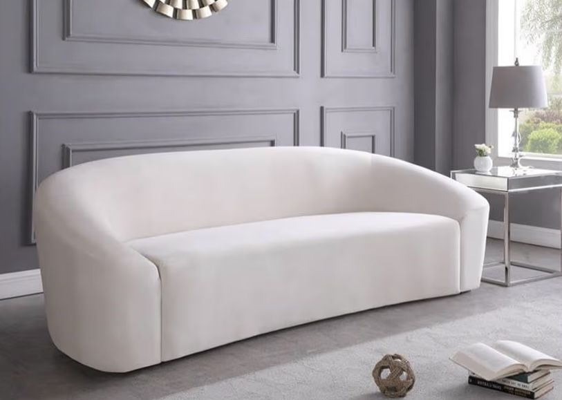 Meridian Furniture 610Cream-S Riley Collection Modern | Contemporary Velvet Upholstered Sofa with Rounded Contemporary Design, Cream, 91" W x 35.5" D x 29.5" H